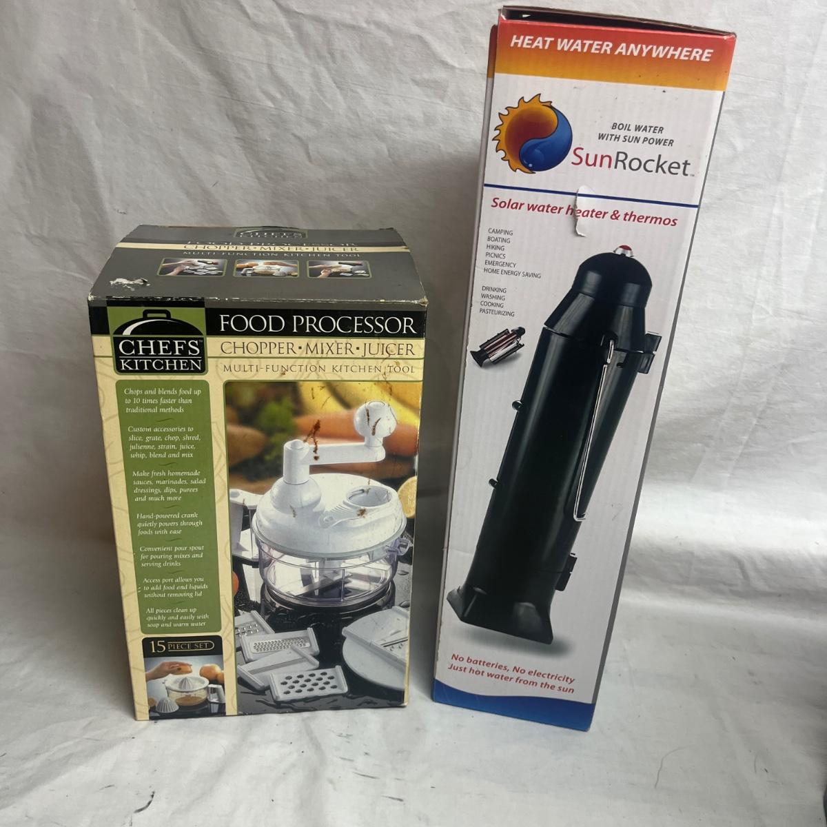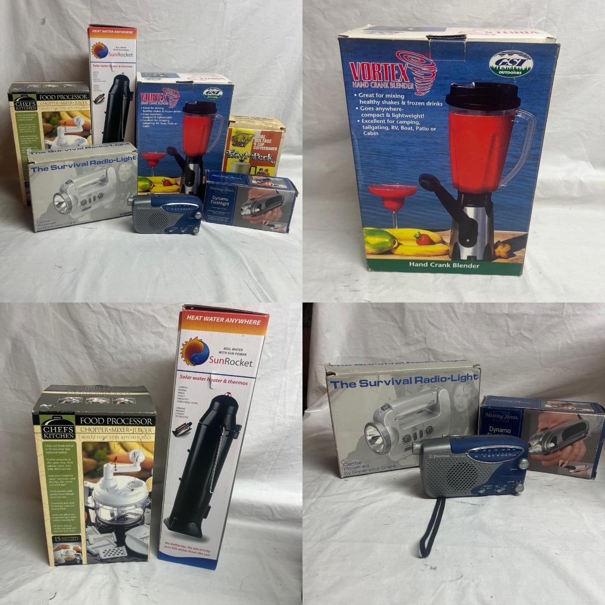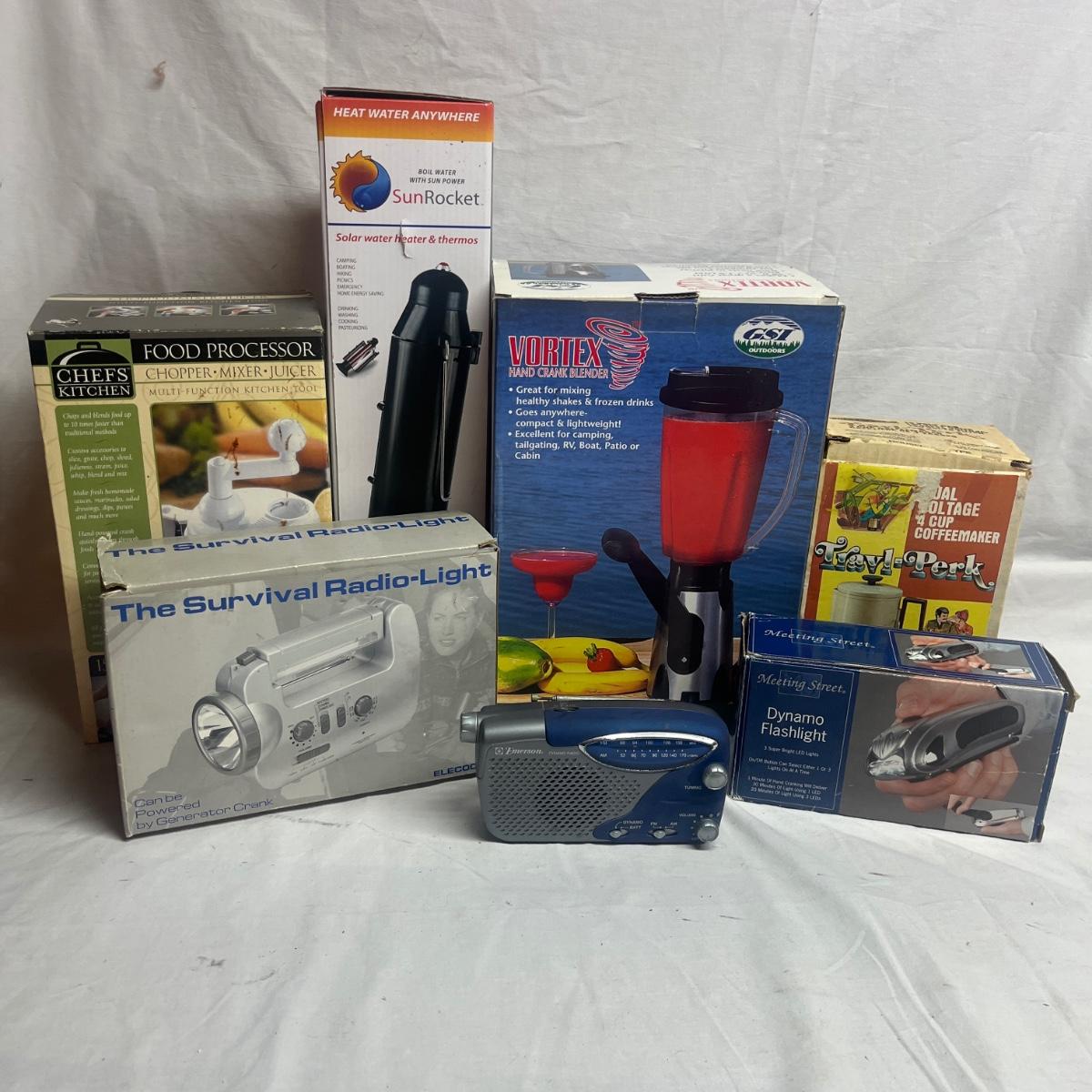 Lot includes a NIB Vortex hand crank blender, NIB Solar water heater/thermos, NIB hand crank food processor, NIB survival radio and flashlight and a hand crank radio and Travl-Perk coffee maker. Vortex box measures 9” x 7” x 13”H.