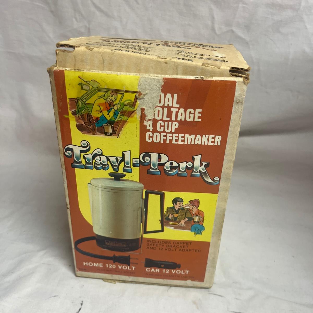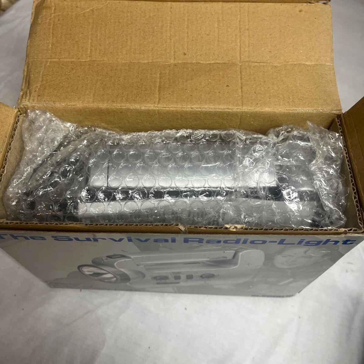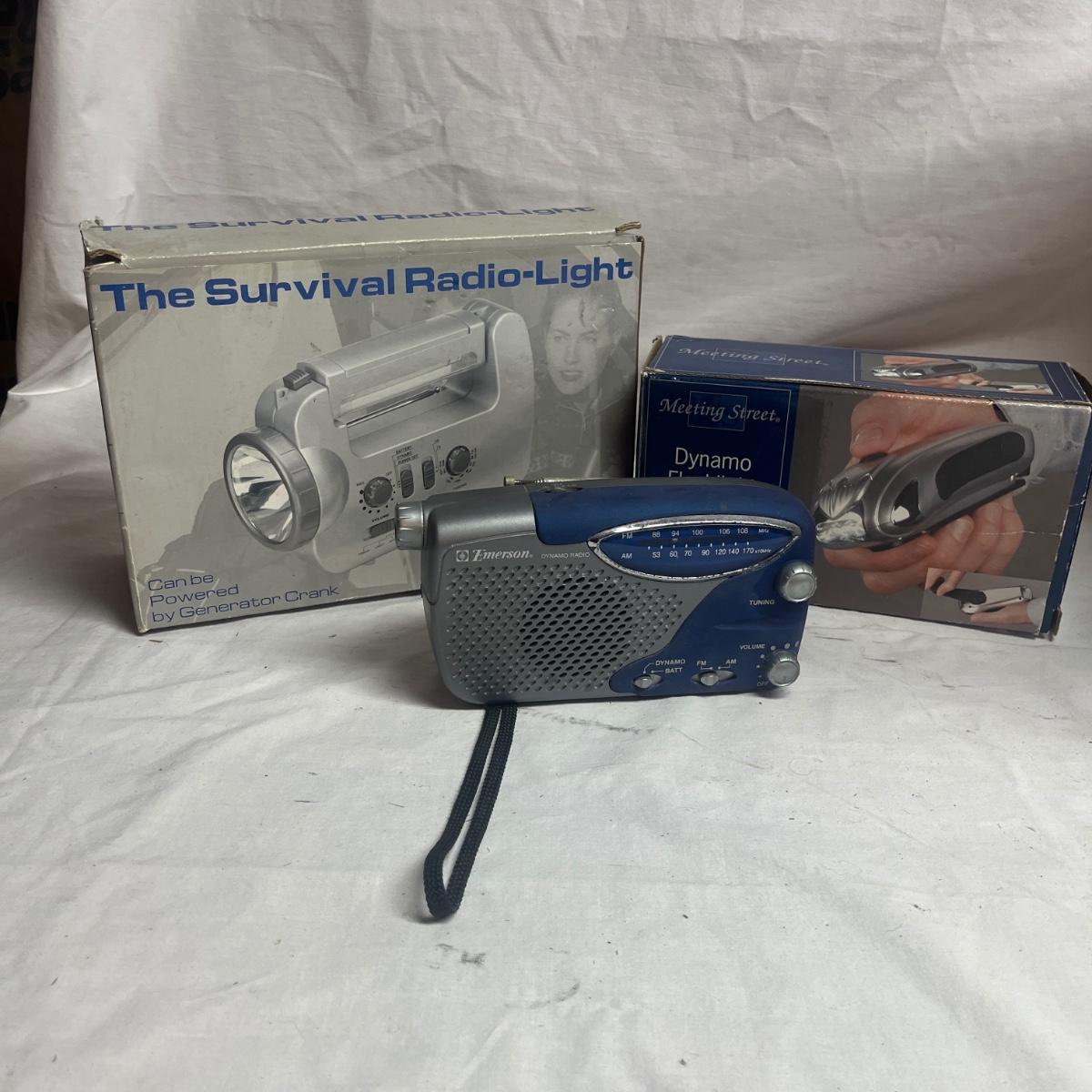 Lot includes a NIB Vortex hand crank blender, NIB Solar water heater/thermos, NIB hand crank food processor, NIB survival radio and flashlight and a hand crank radio and Travl-Perk coffee maker. Vortex box measures 9” x 7” x 13”H.