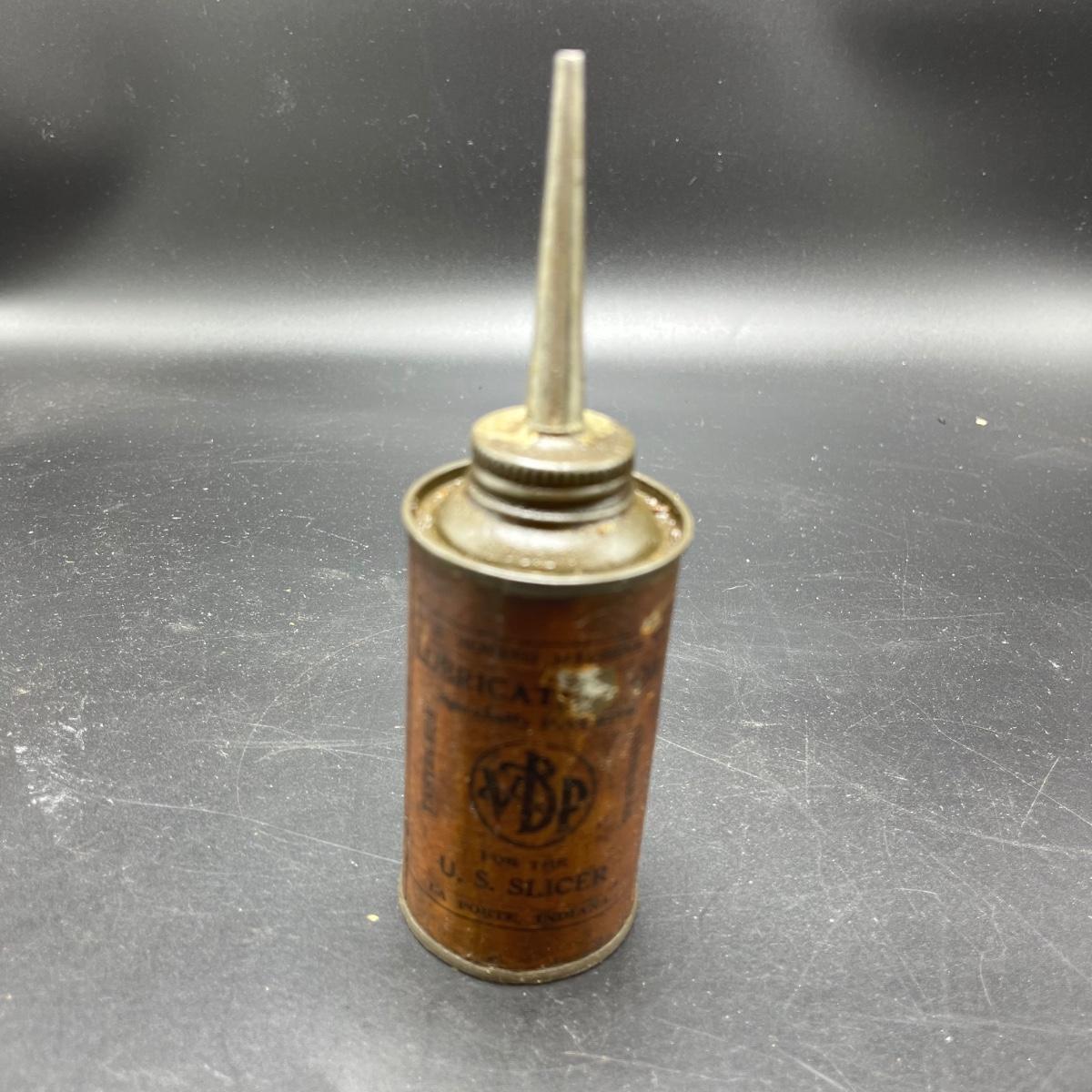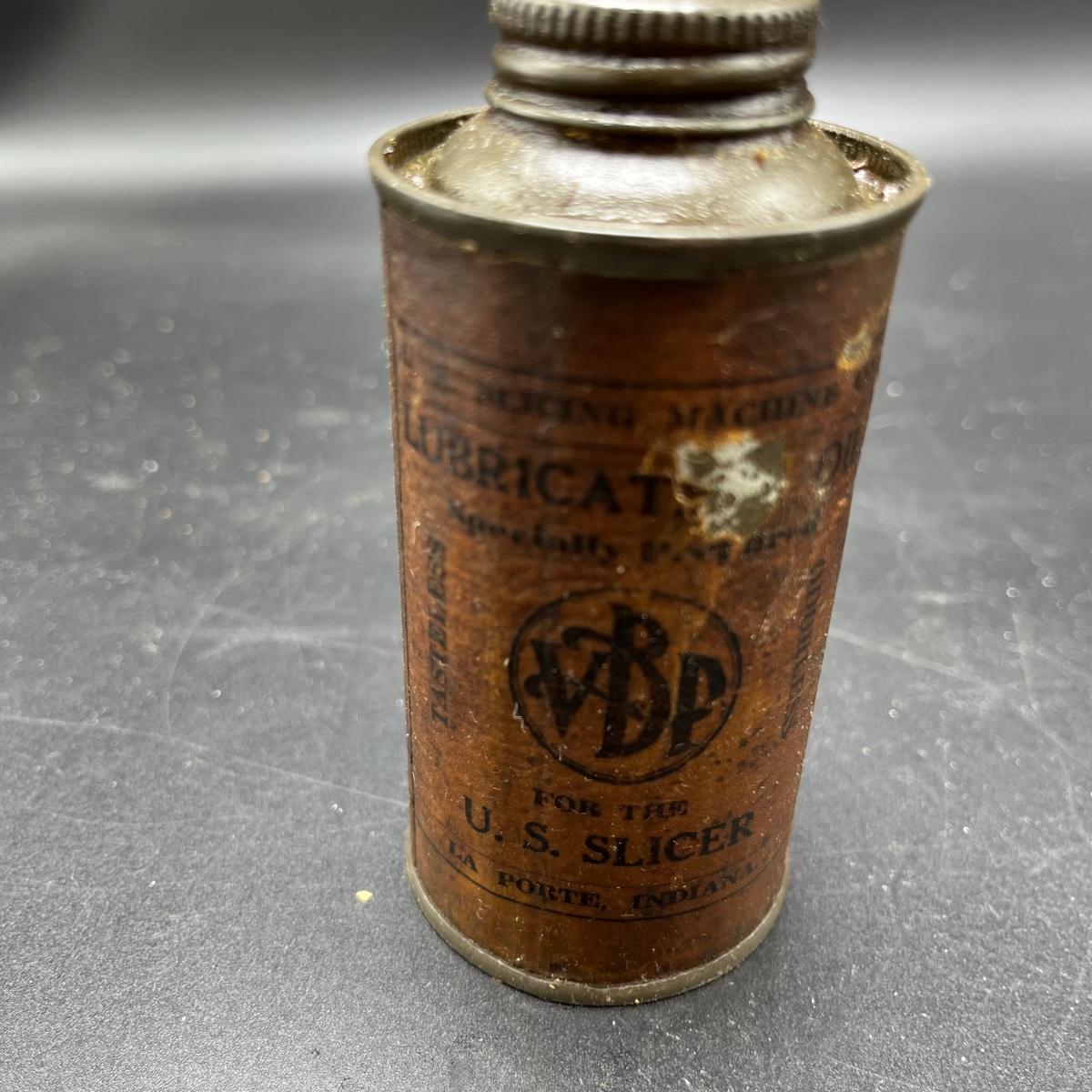 Lot includes a VPB U.S.Slicer oil can. Can measures 1.75”D x 7” tall.