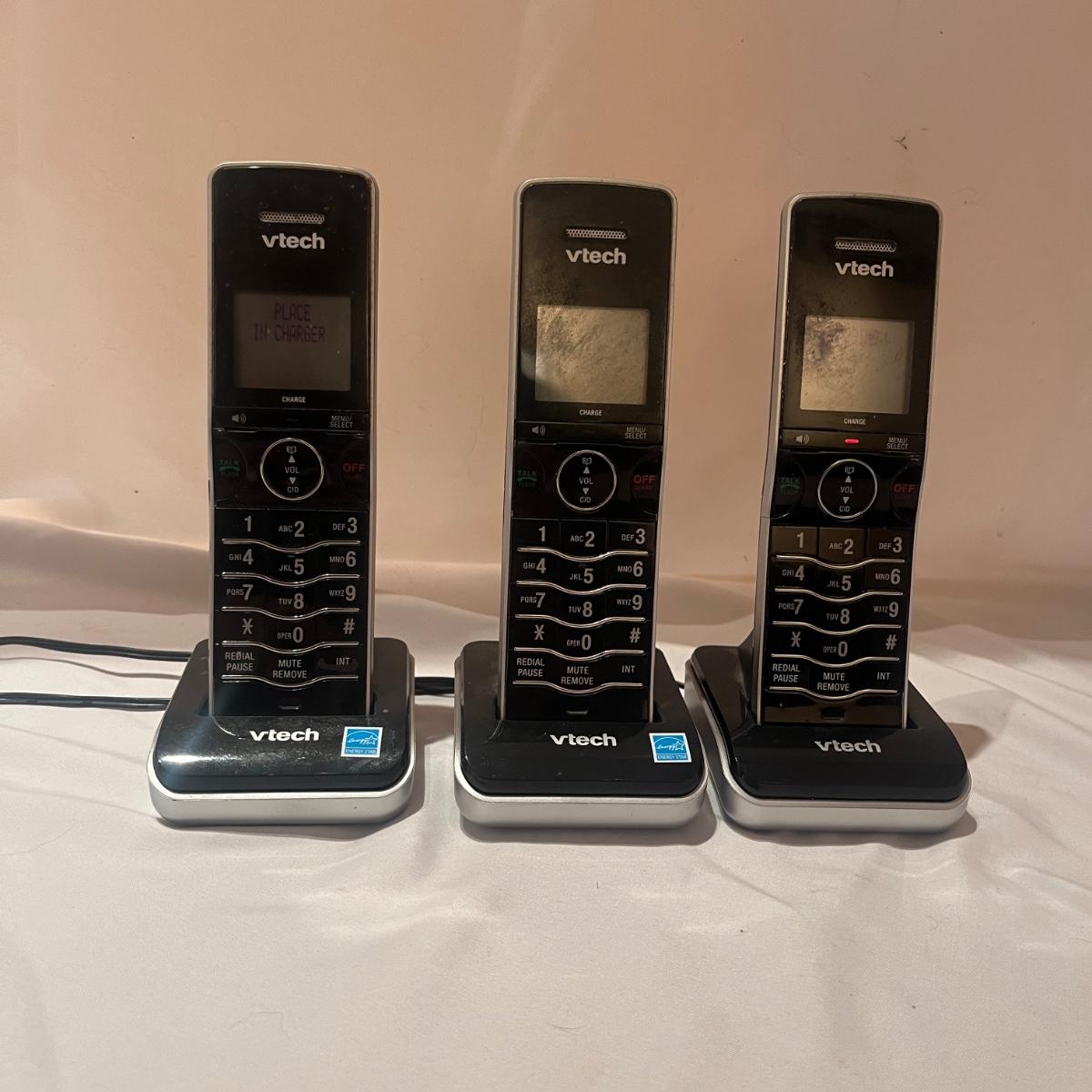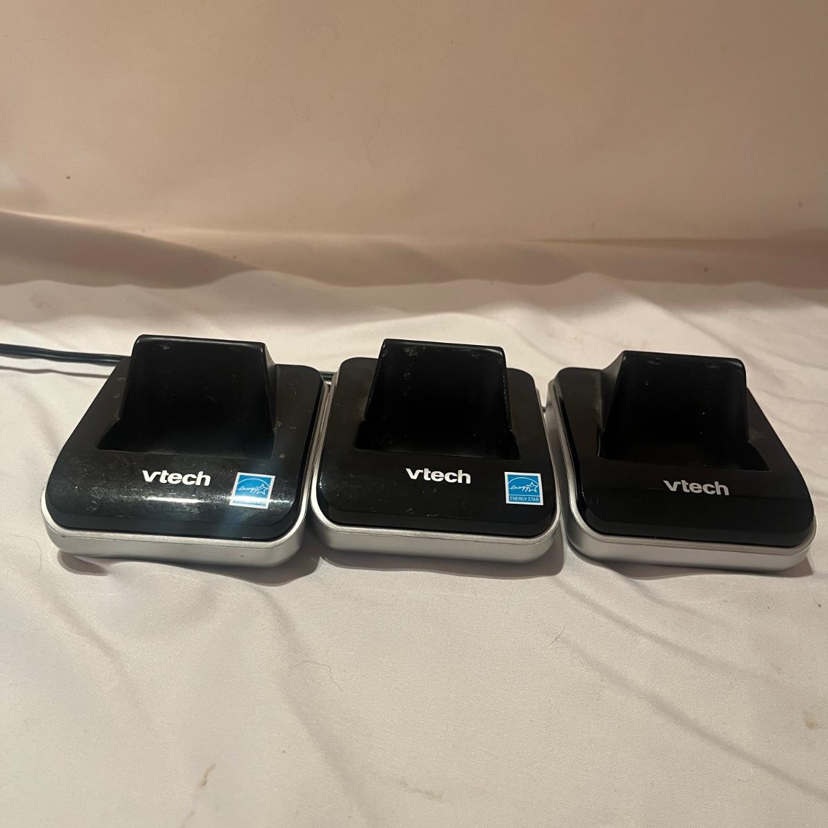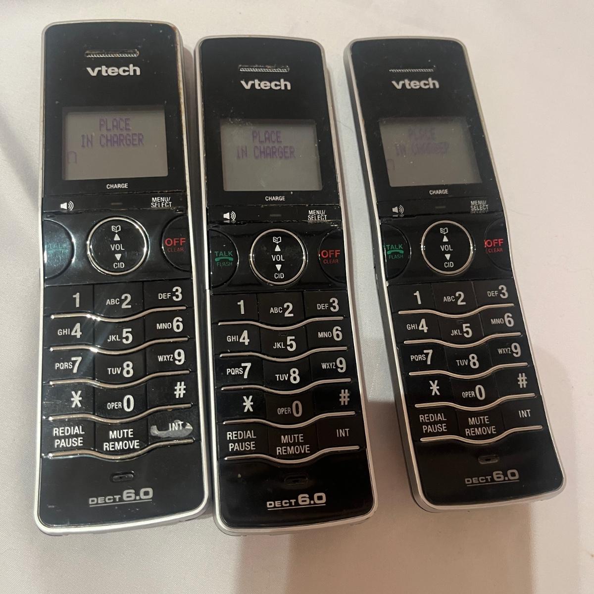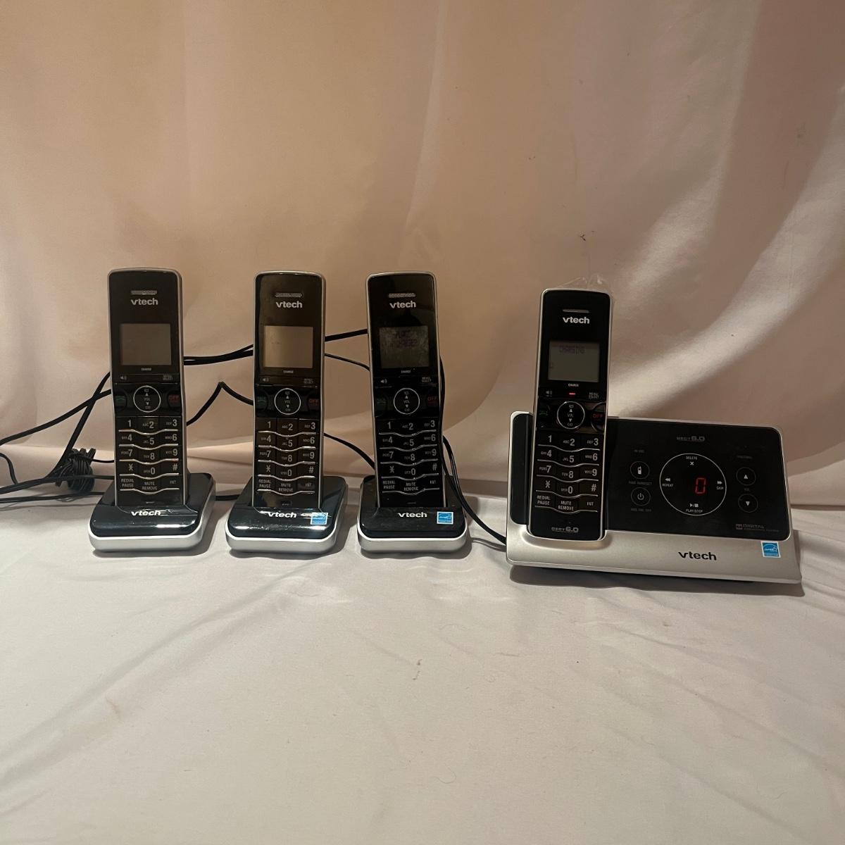 Lot contains a Vtech DECT 6.0 phone system that includes an answering machine with cordless phone and three satellite phone docks with three cordless phones. All items powered on when plugged in.