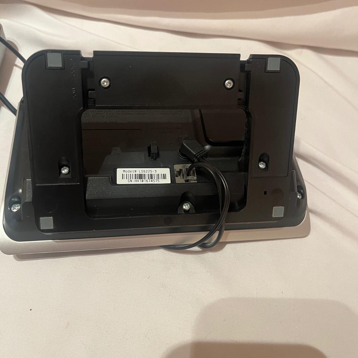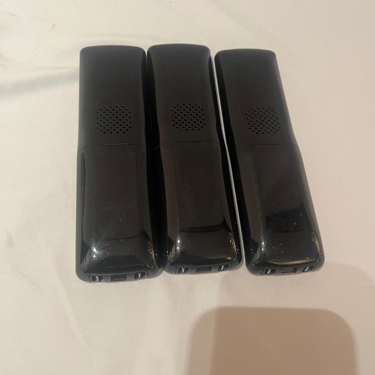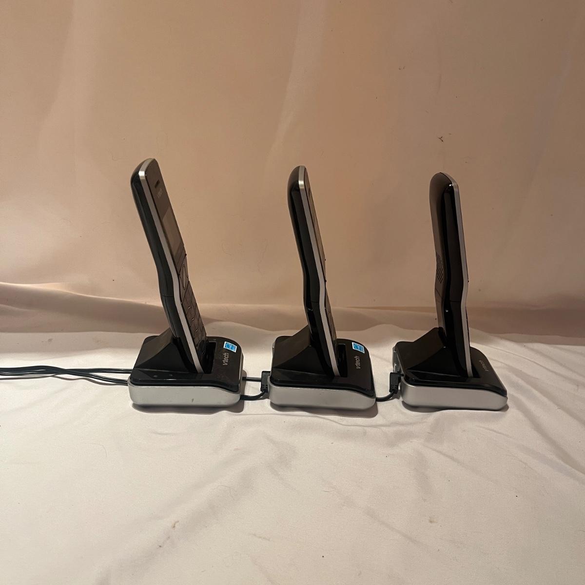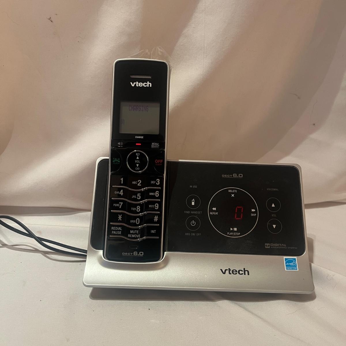 Lot contains a Vtech DECT 6.0 phone system that includes an answering machine with cordless phone and three satellite phone docks with three cordless phones. All items powered on when plugged in.