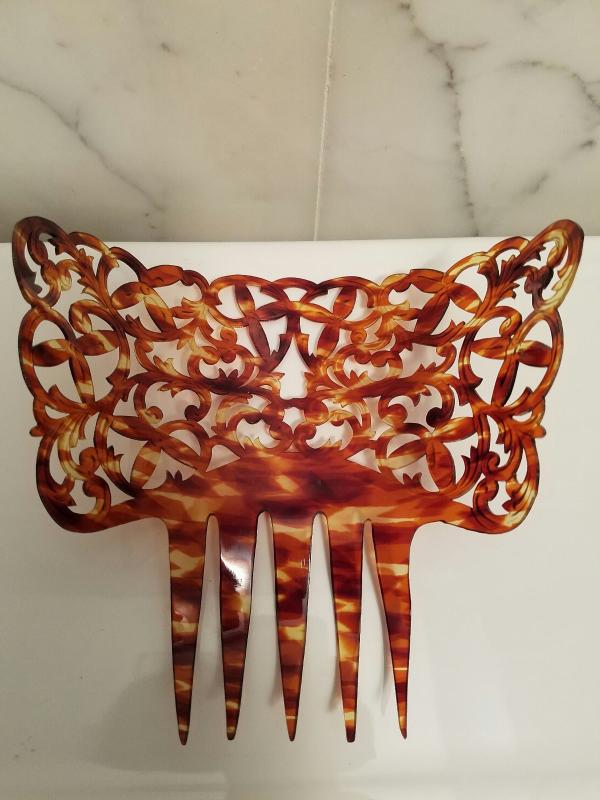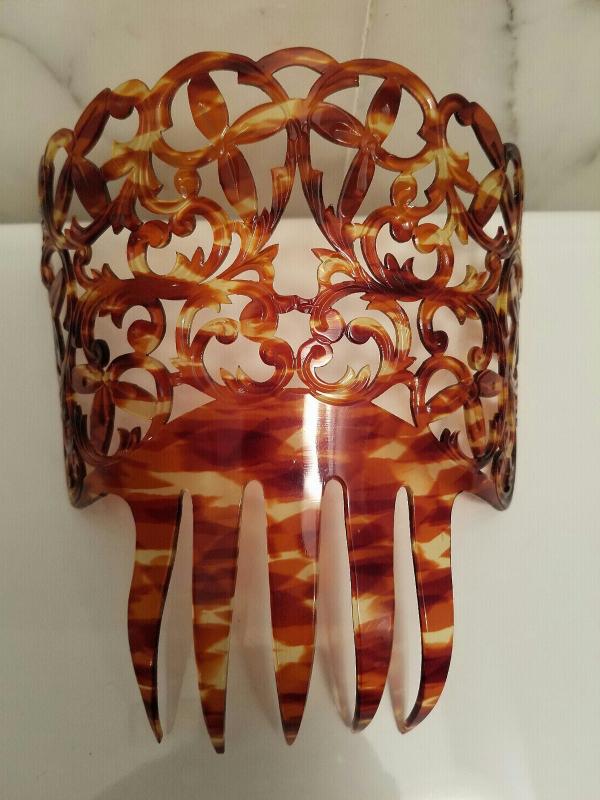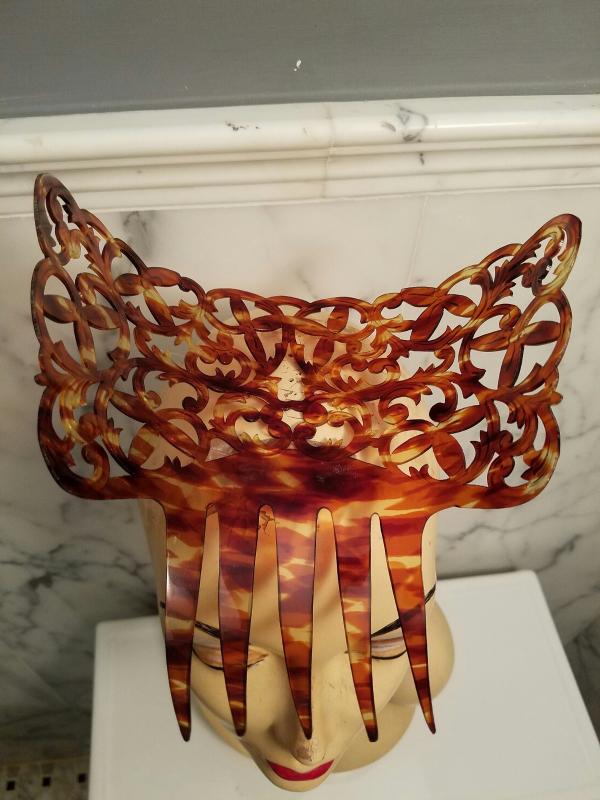 This one is quite Rare and very Large. from the late 1920's early 1930's Celluloid shell Spanish Flamenco Peineta Hair Comb. Filigree decorated open work design that is to die for.