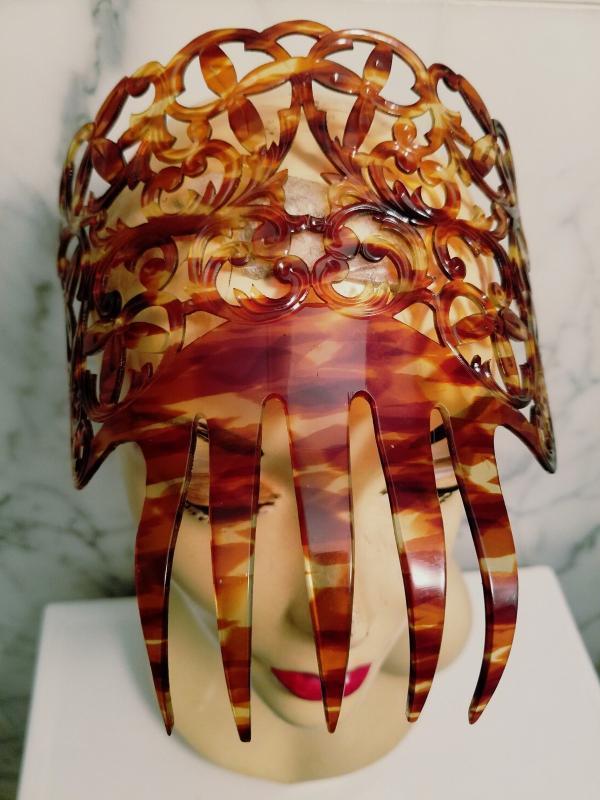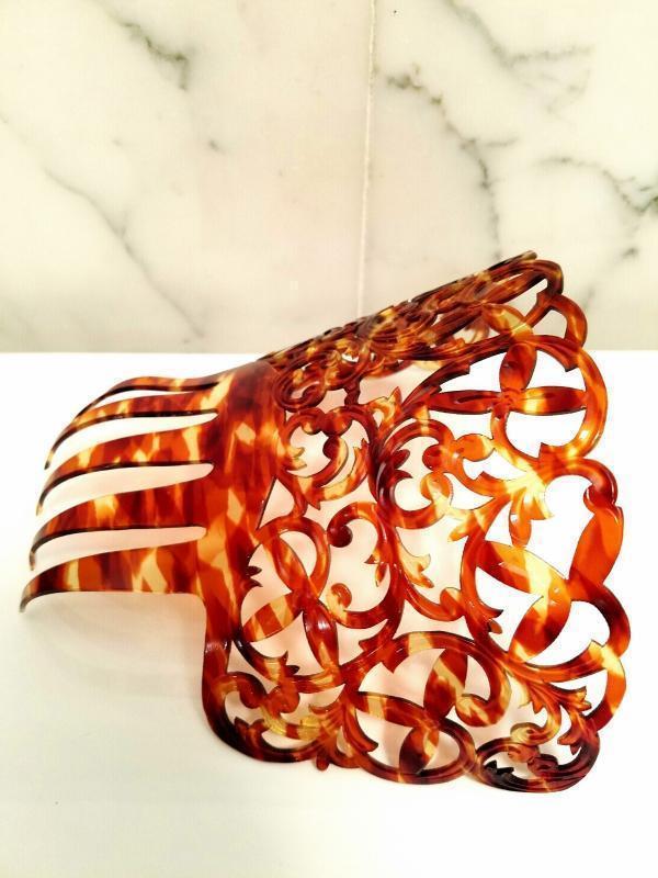 This one is quite Rare and very Large. from the late 1920's early 1930's Celluloid shell Spanish Flamenco Peineta Hair Comb. Filigree decorated open work design that is to die for.