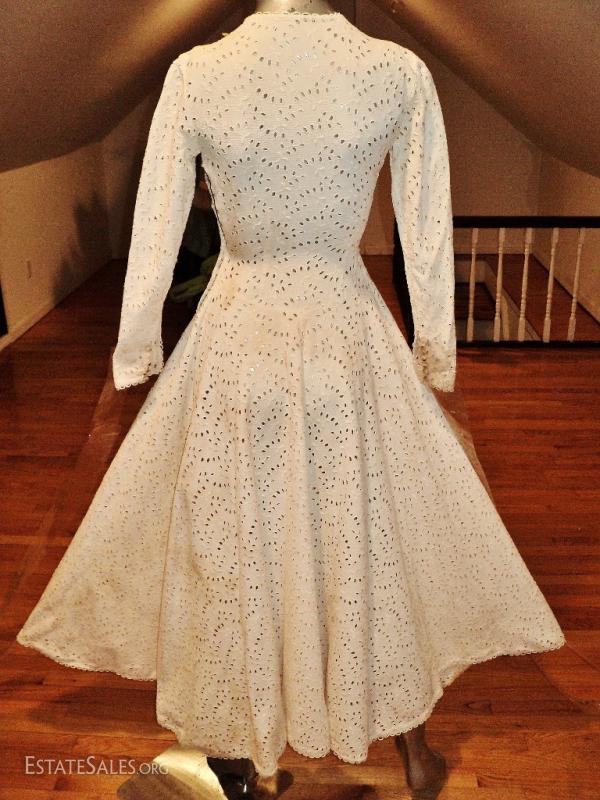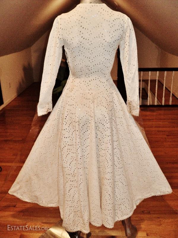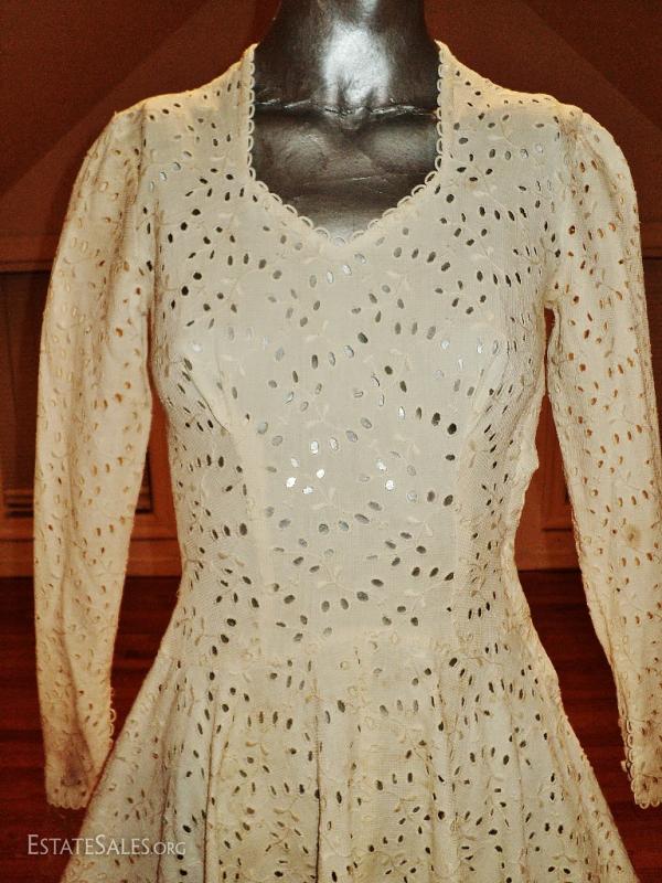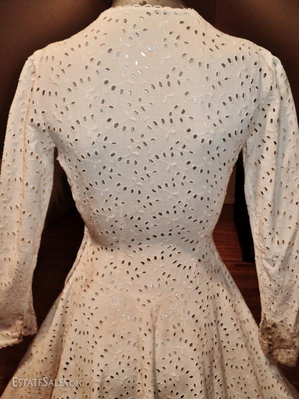 Circa late 1930's early 1940's this one is an original. All hand embroidered eyelet on a white cotton linen. Amazing fitted details with hook & eye on the side.. In very good condition for its age but will need some cleaning