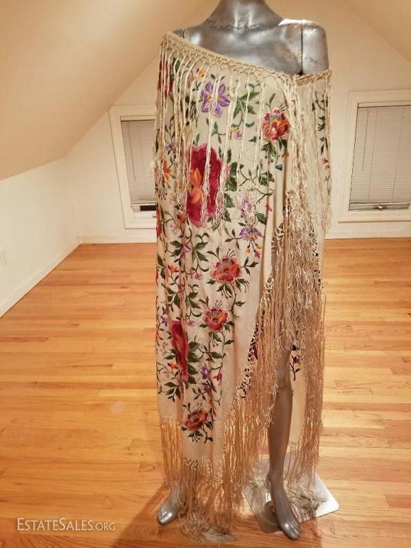Vtg 1930's silk hand embroidered Japanese Piano shawl/Pareo long fringes