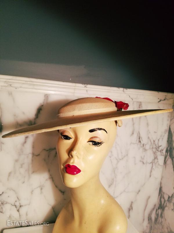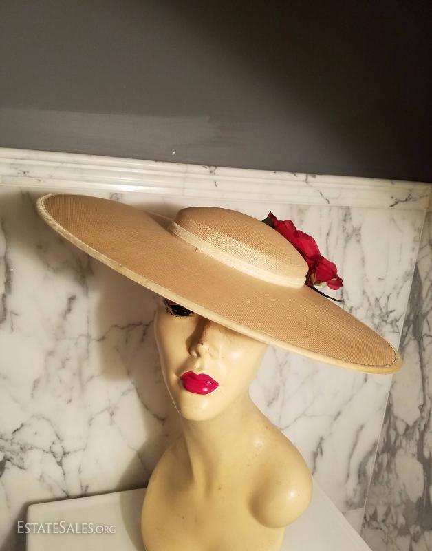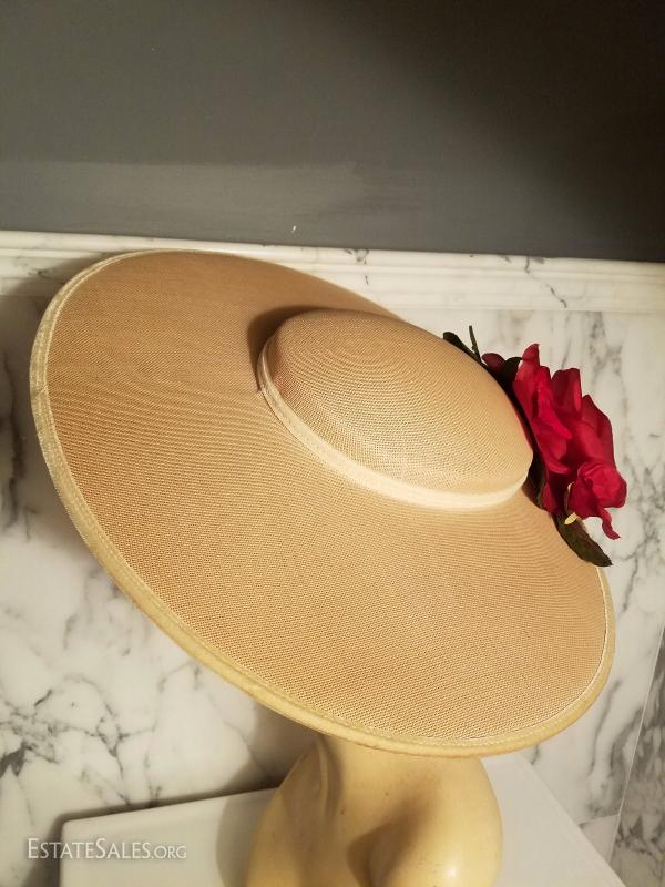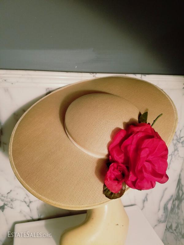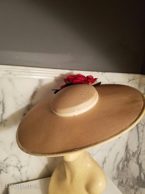 . This one is very rare and amazing. It is really a spectator wide trim platter tilt Hat with velour trims and millinery flowers. in side has a two side reverse crown for hold . In amazing condition for its age. No label but I believe it is a Flo- Raye.