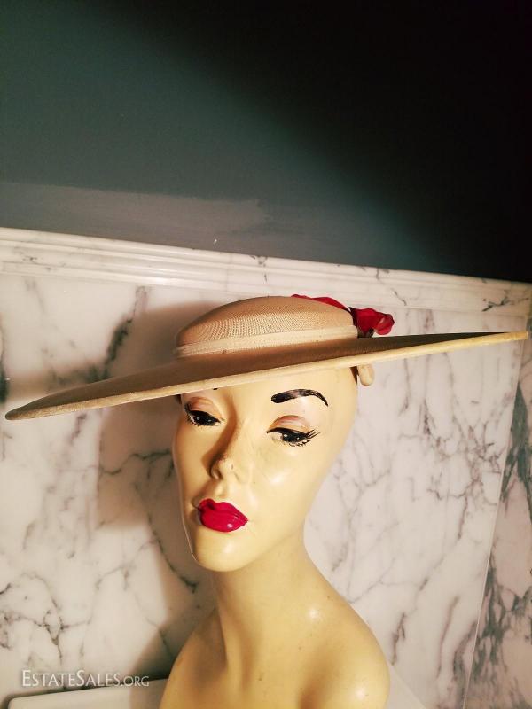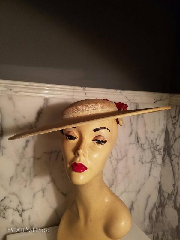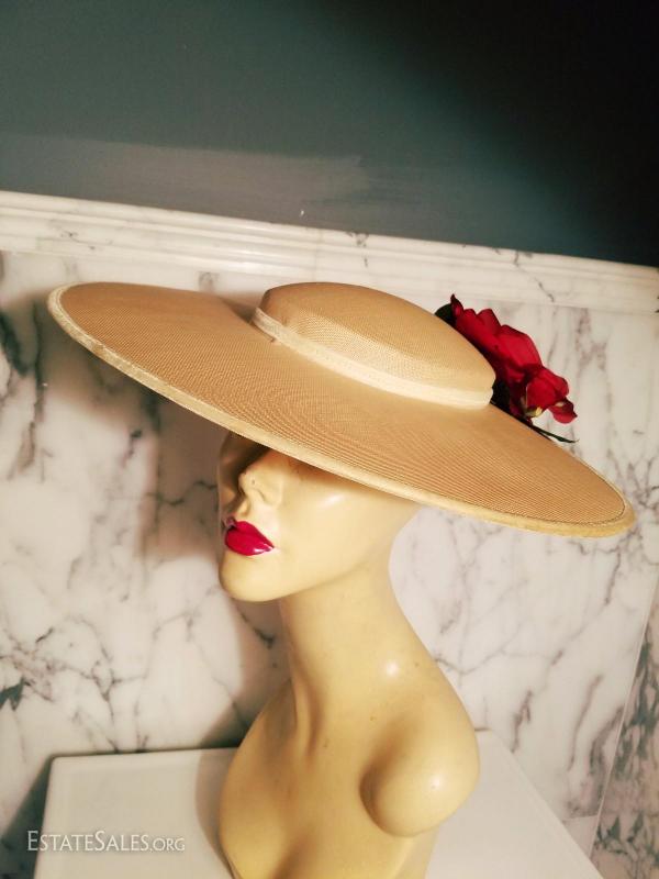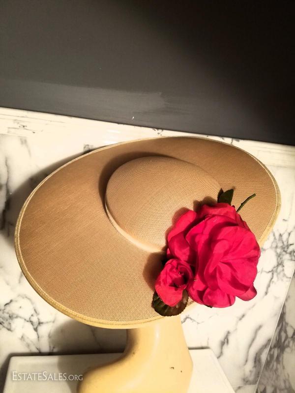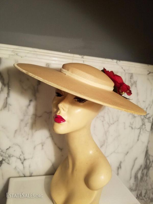 . This one is very rare and amazing. It is really a spectator wide trim platter tilt Hat with velour trims and millinery flowers. in side has a two side reverse crown for hold . In amazing condition for its age. No label but I believe it is a Flo- Raye.