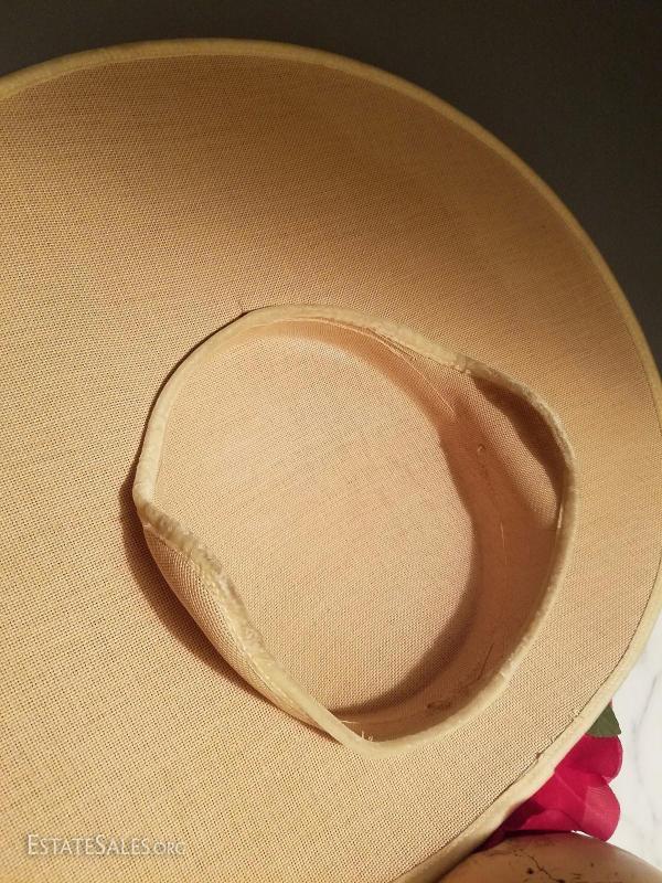 . This one is very rare and amazing. It is really a spectator wide trim platter tilt Hat with velour trims and millinery flowers. in side has a two side reverse crown for hold . In amazing condition for its age. No label but I believe it is a Flo- Raye.