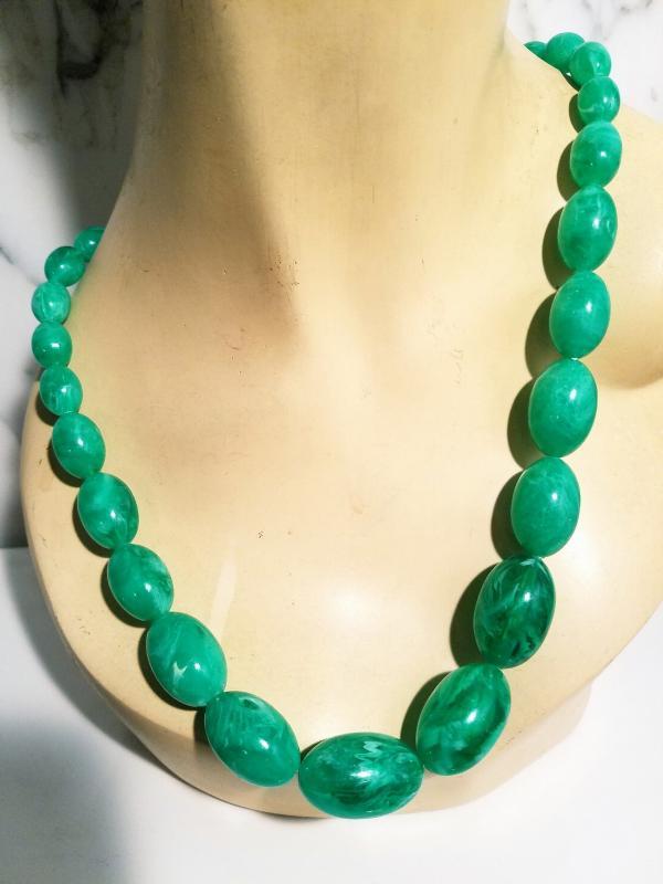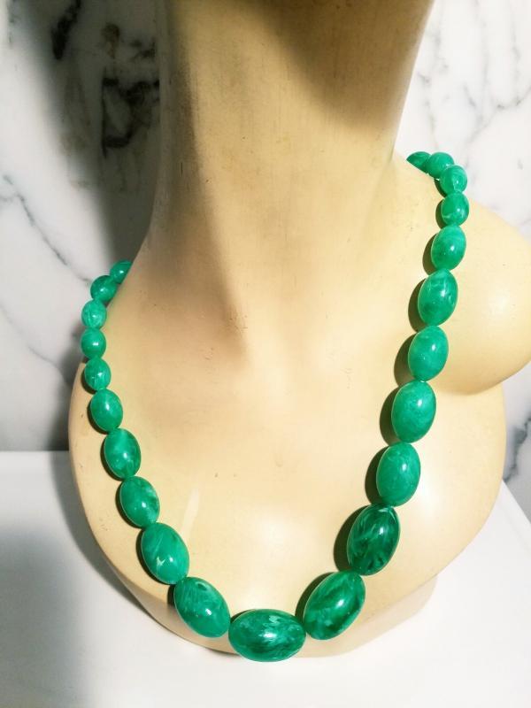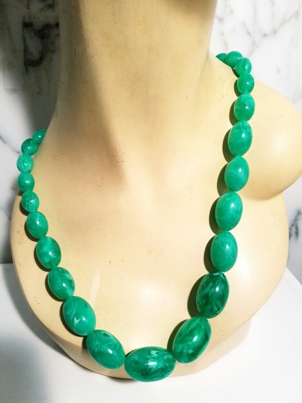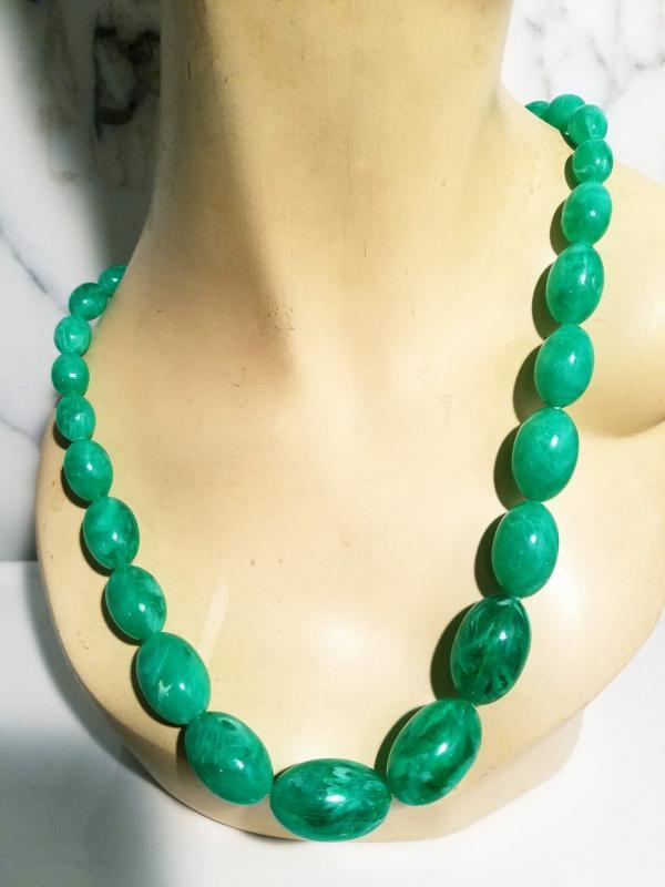 A real beauty I believe it is Celluloid Long string necklace oval large beads the back closure is brass metal. In amazing condition
