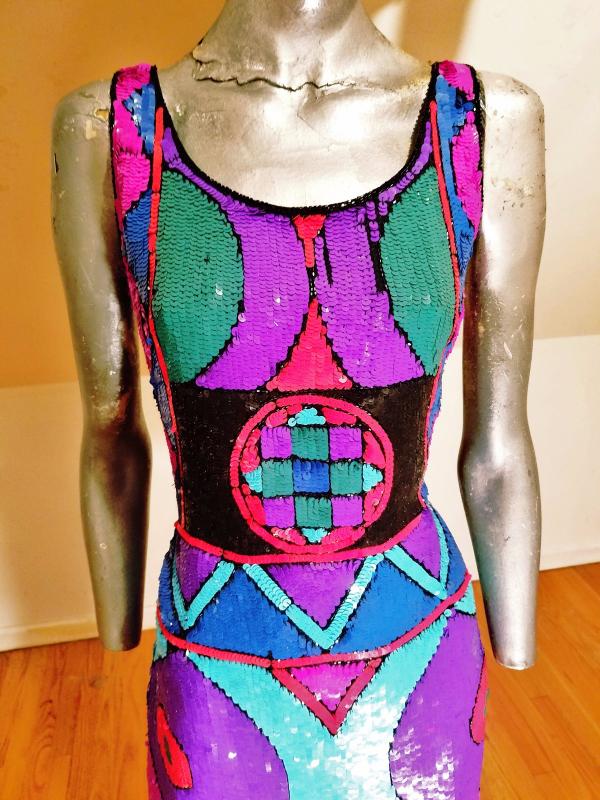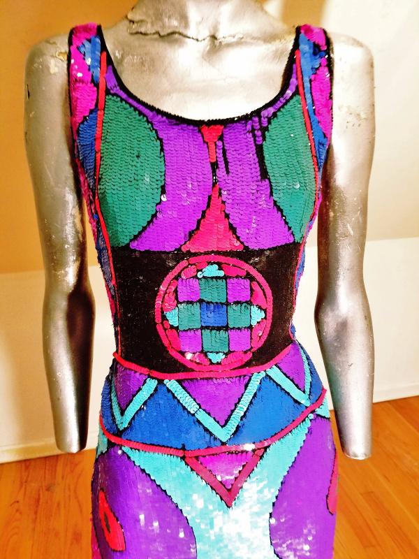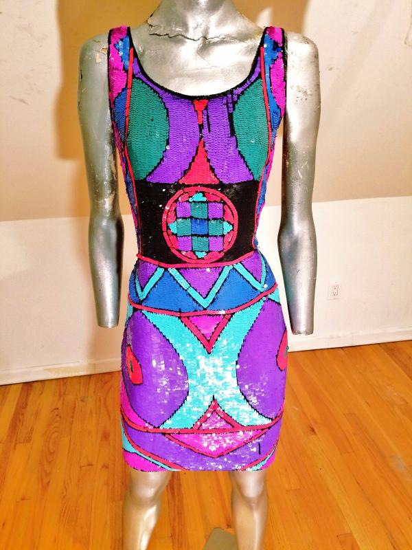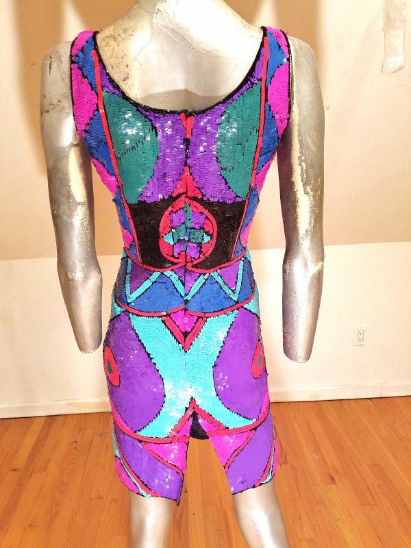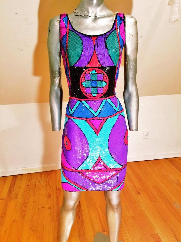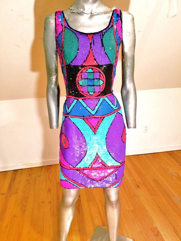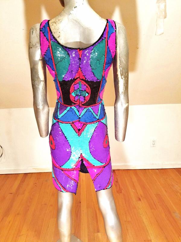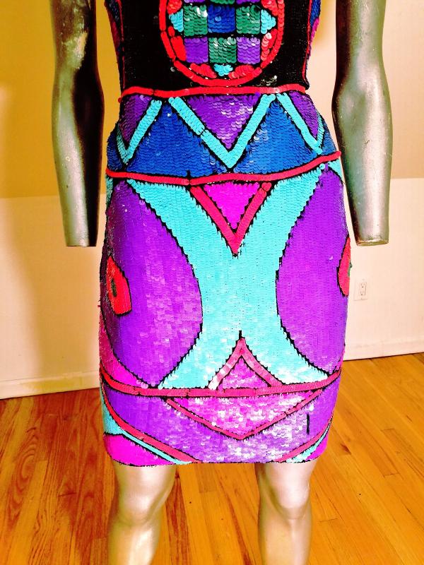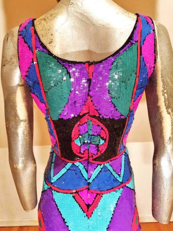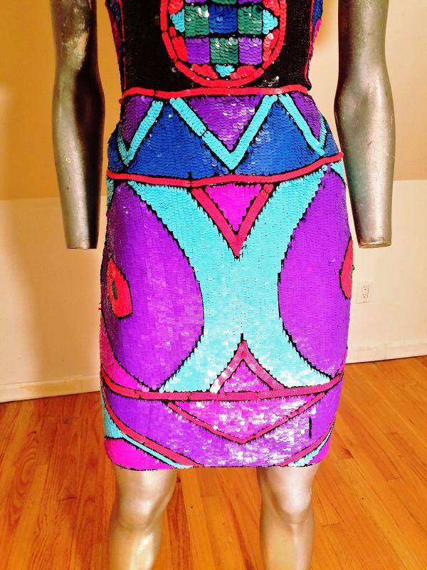 Magnificent is the word for this Geometric fully sequined embellished dress from the 1970's Pure silk .All hand sequined amazing color and condition. To die for