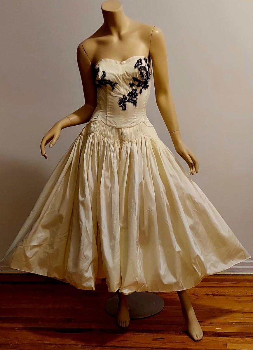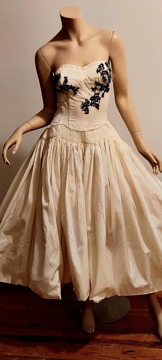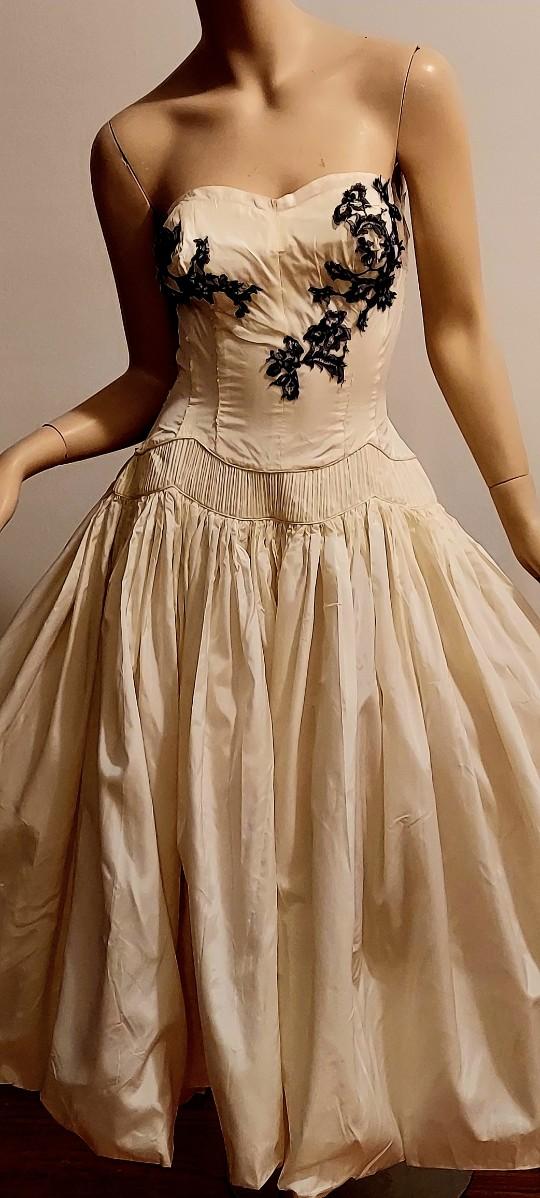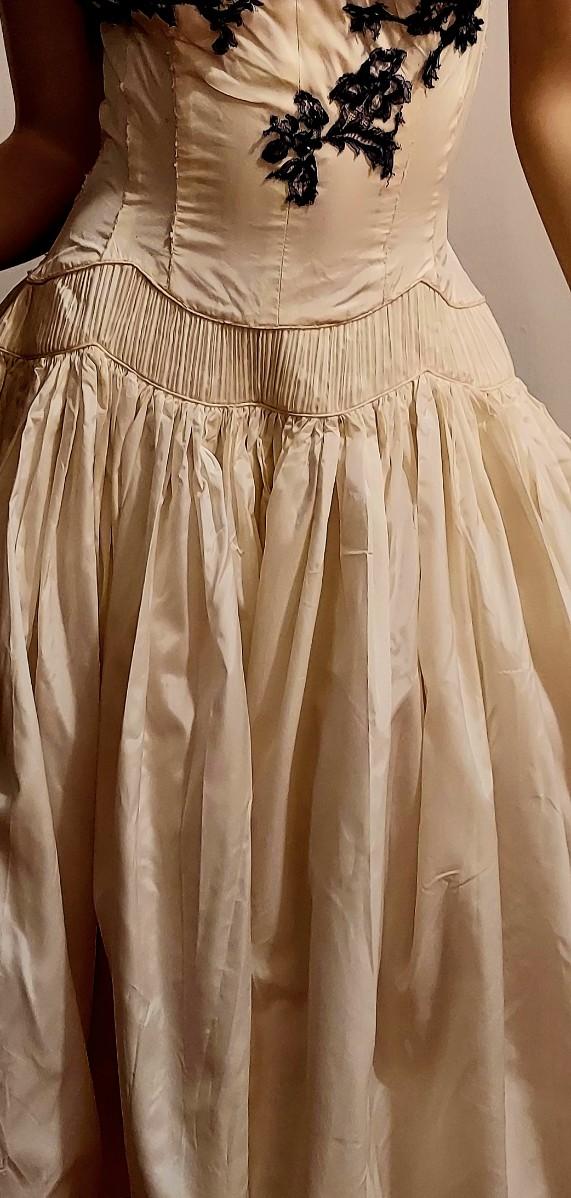 This one is truly amazing in beauty and Style. Strapless with French black lace applique at the Bodice. Bones at Bodice and back metal Zipper. It has Tulle Crinoline and Bouffant layer with Horse hair.