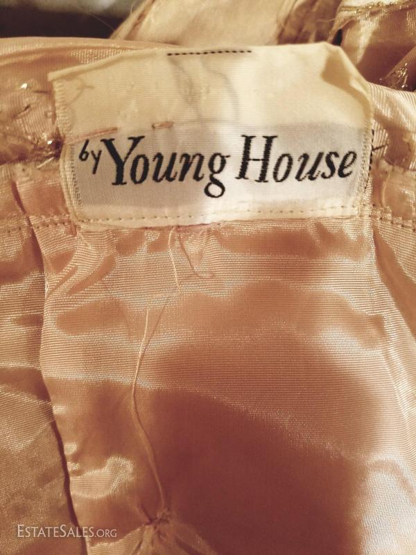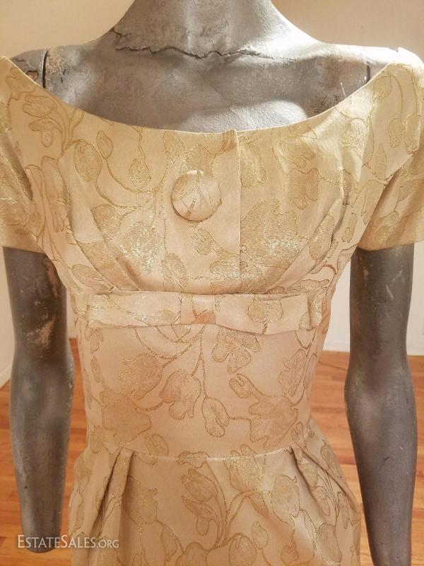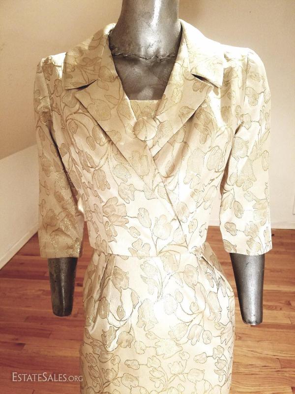 A stunning gold brocade 2 piece ensemble dress and jacket with beautiful details and a large front gold covered button. Lined and in amazing vintage condition like new. Made by then famous Young House.
