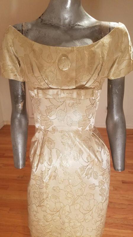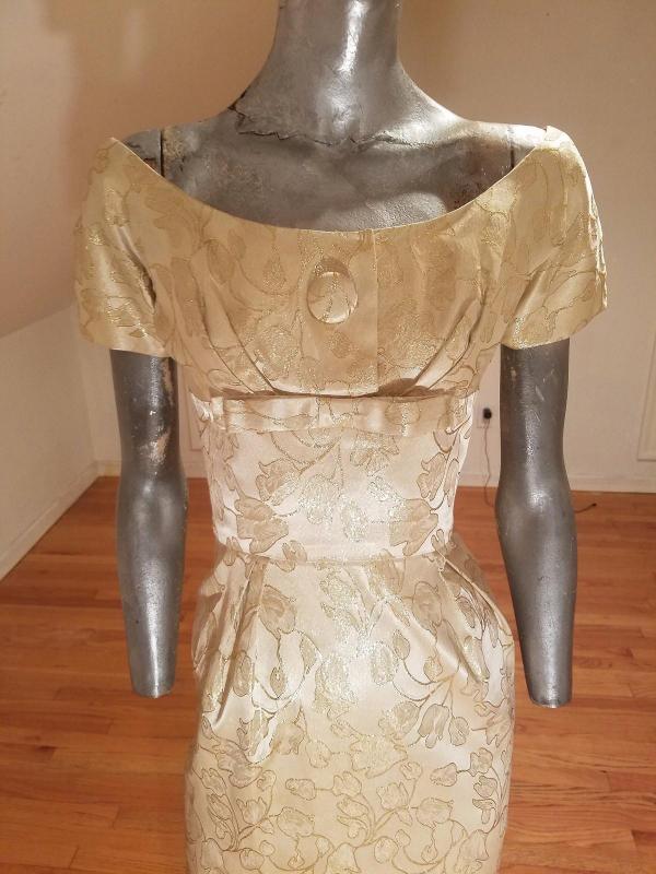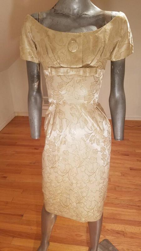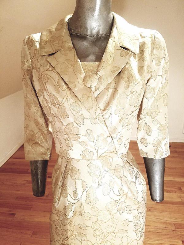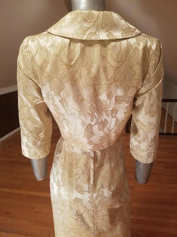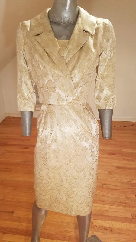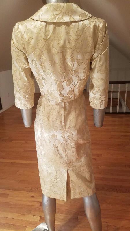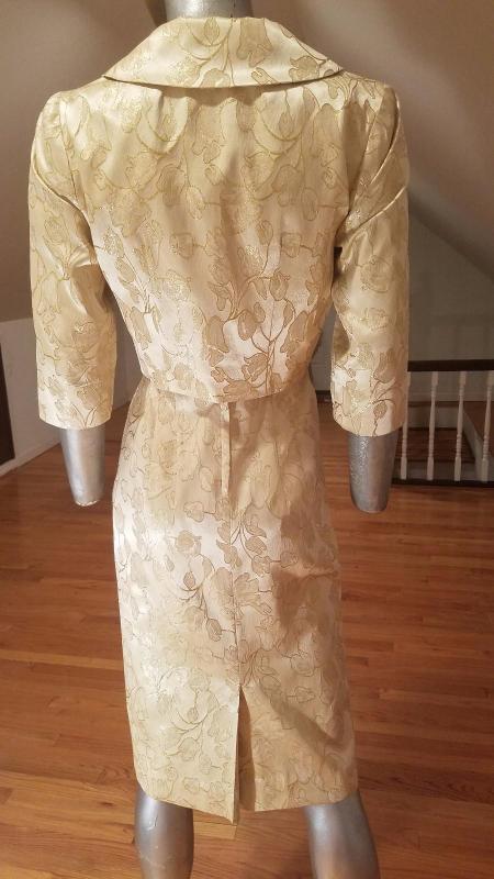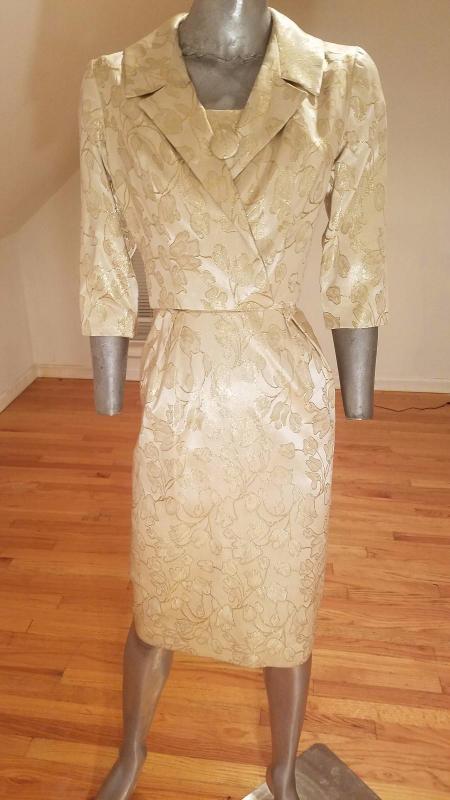 A stunning gold brocade 2 piece ensemble dress and jacket with beautiful details and a large front gold covered button. Lined and in amazing vintage condition like new. Made by then famous Young House.