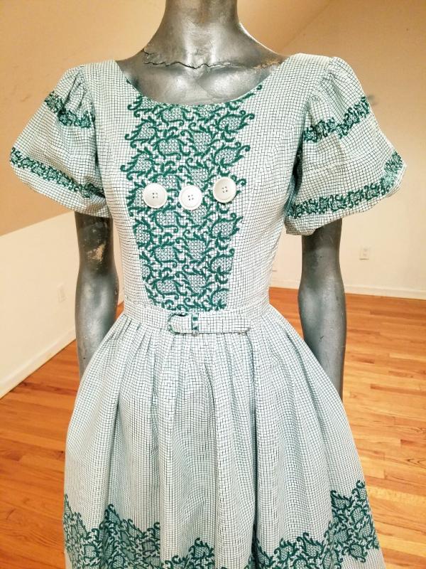 A true beauty from the late 1940's green/white grid printed cotton rockabilly sweep dress with floral pattern puff sleeves and border .Full sweep skirt filled waist with belt and back metal zipper. In amazing condition.