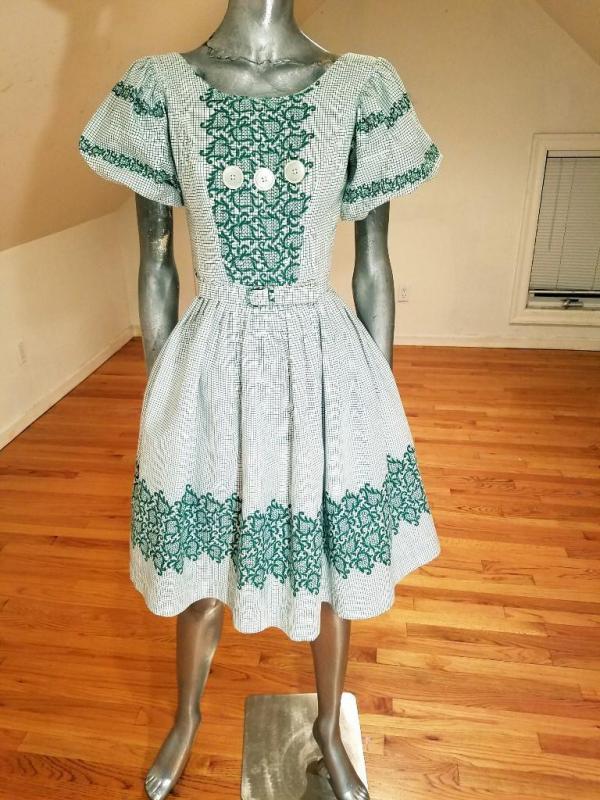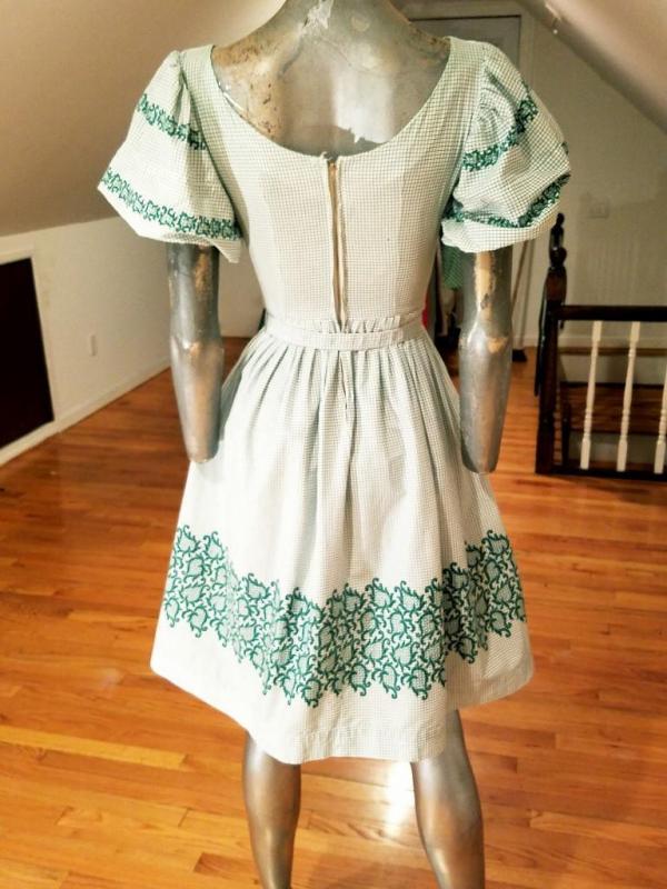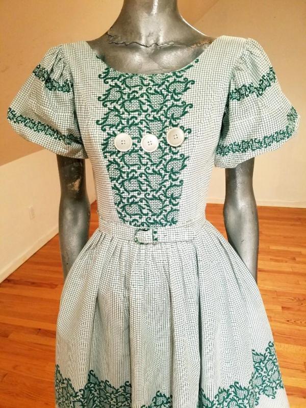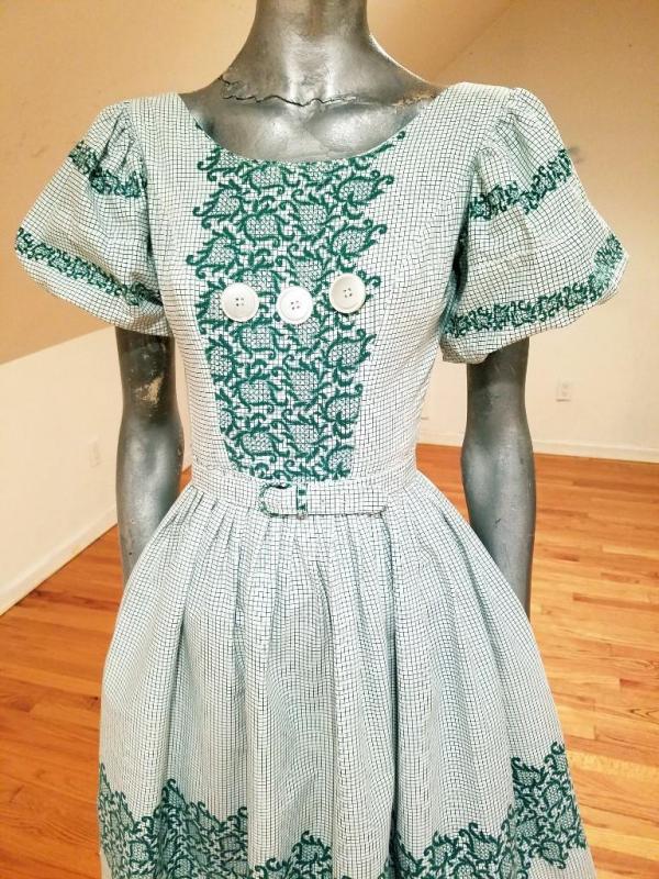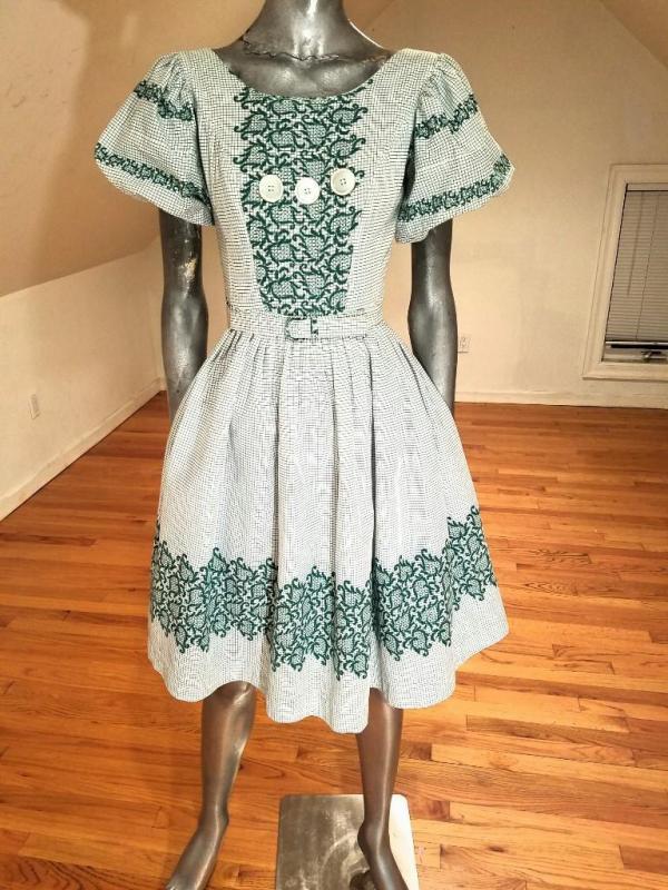 A true beauty from the late 1940's green/white grid printed cotton rockabilly sweep dress with floral pattern puff sleeves and border .Full sweep skirt filled waist with belt and back metal zipper. In amazing condition.