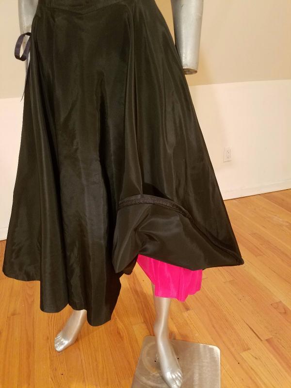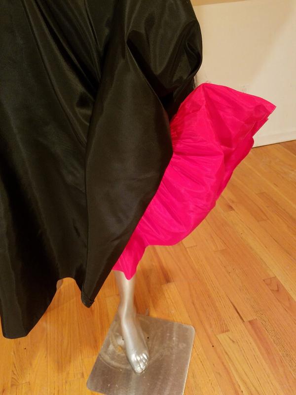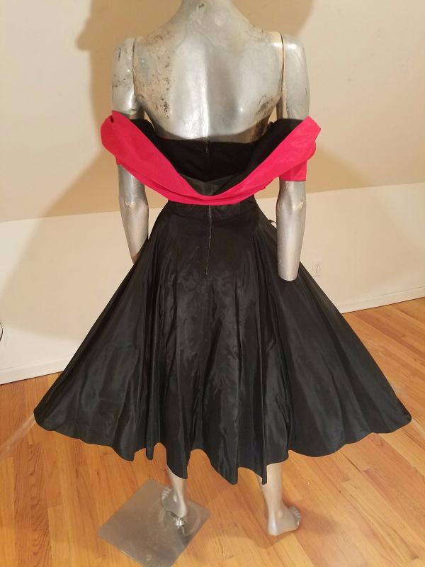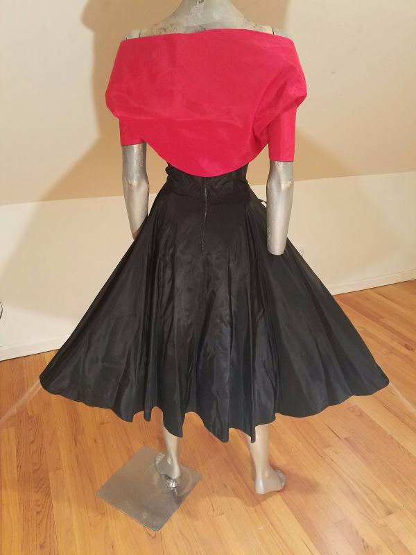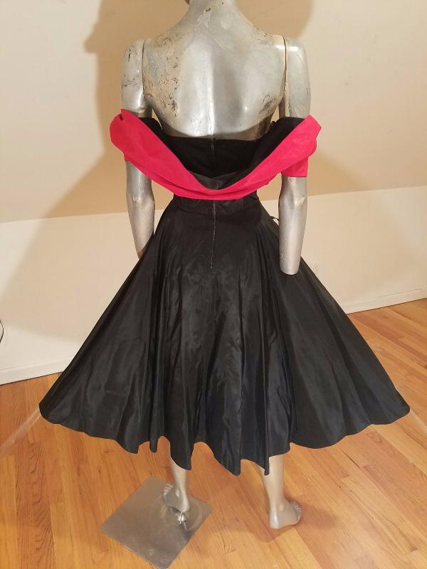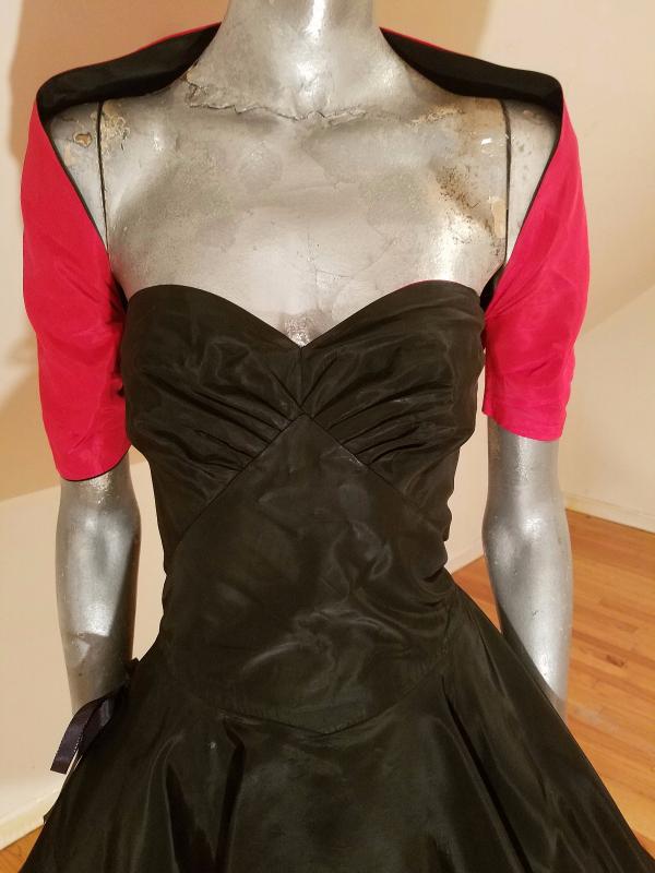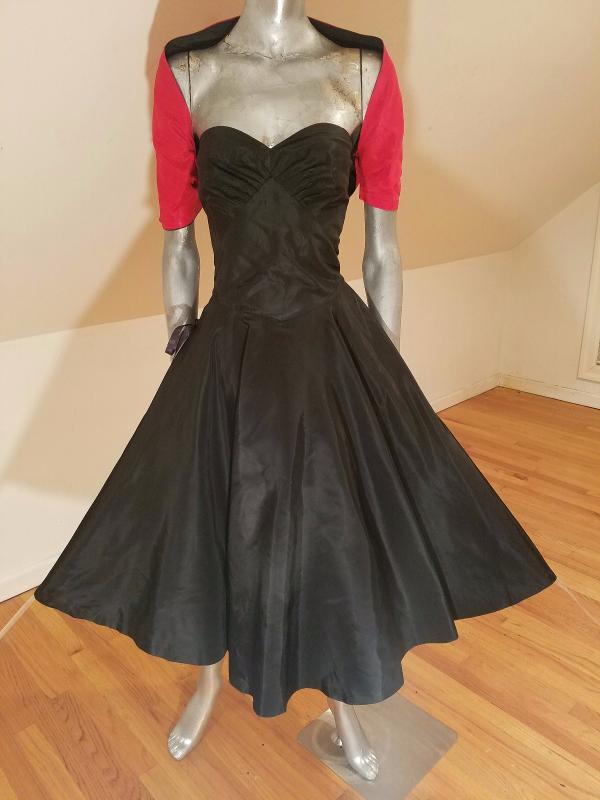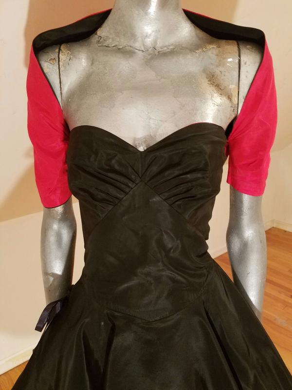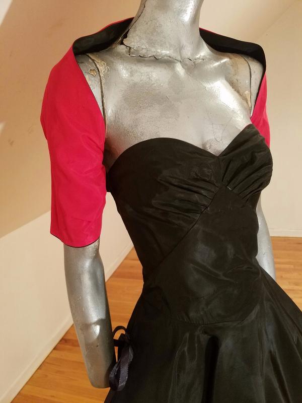An amazing beauty of a dress and shrug in taffeta with a red shrug and a side kitten bow,this one is timeless a Collectors dream