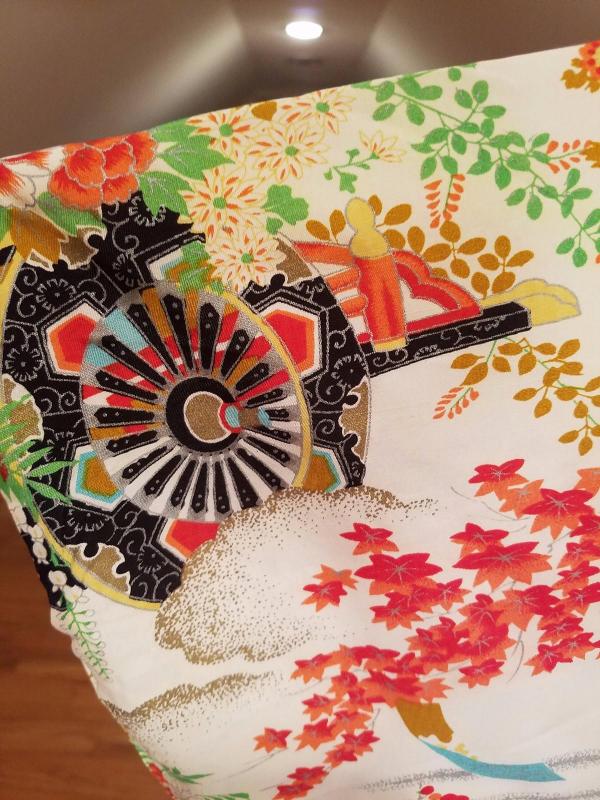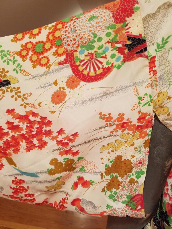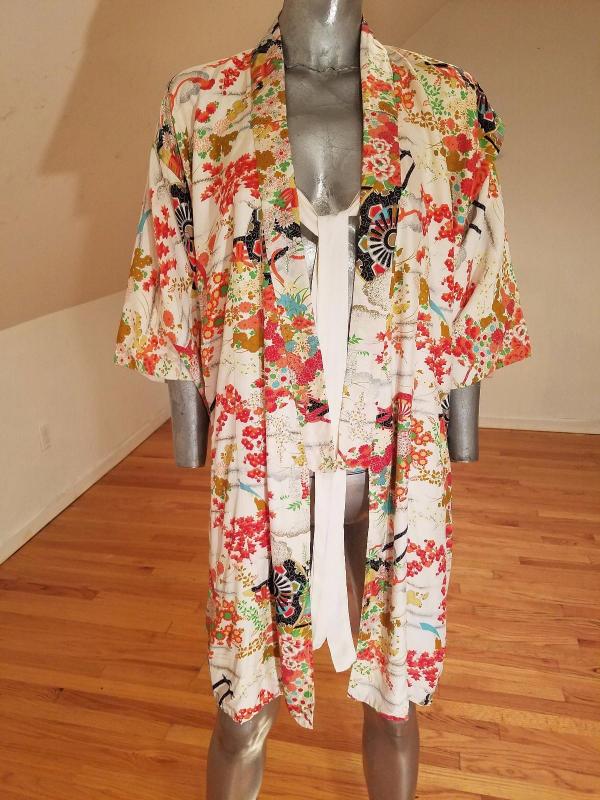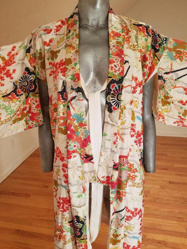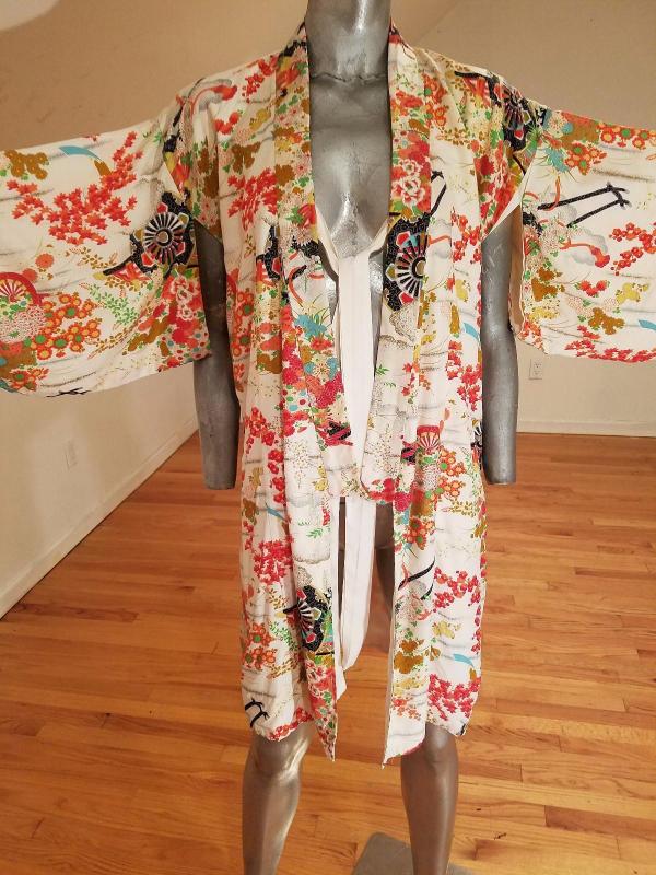 Belonging to a Chinese Diplomat living in Kyoto Japan by the Gion district This one is all hand painted . Haori old gold and multi rouge painted in Shibori Art. Hand stitched throughout and magnificent