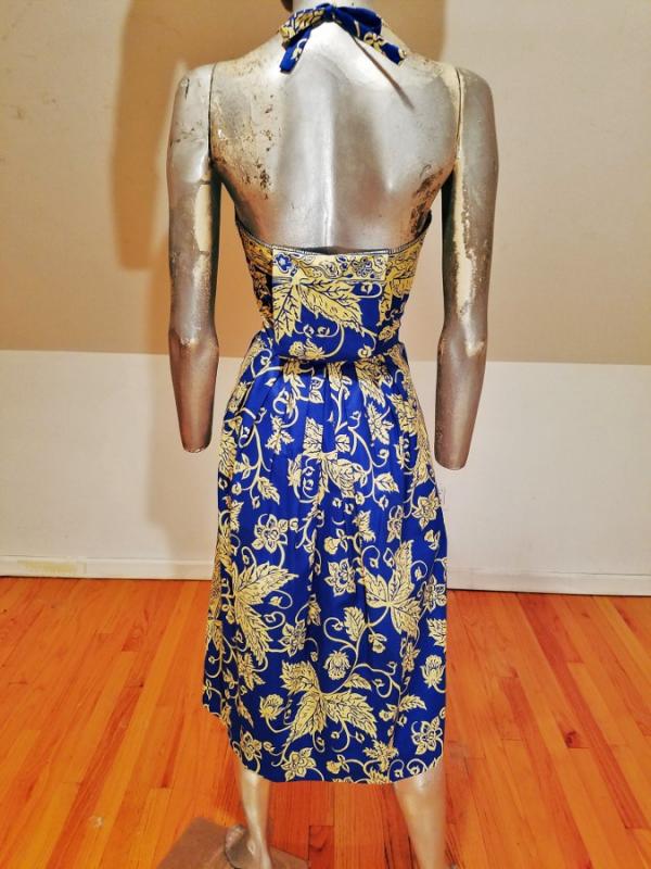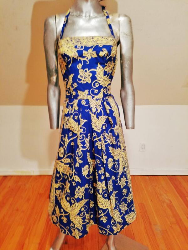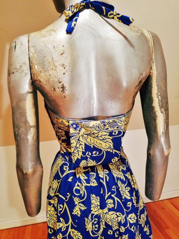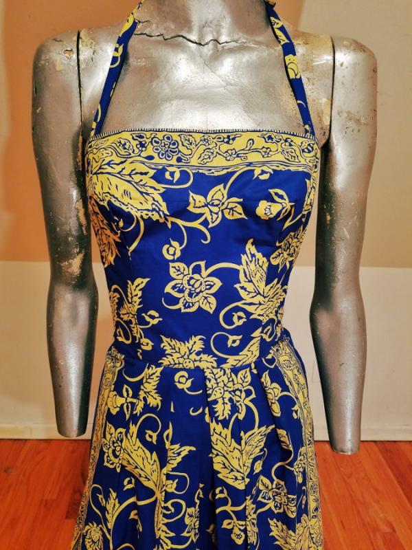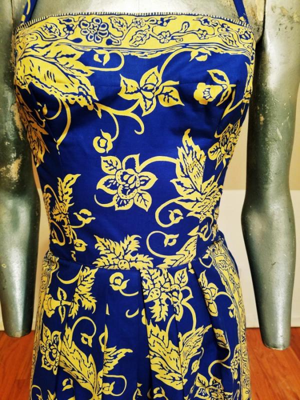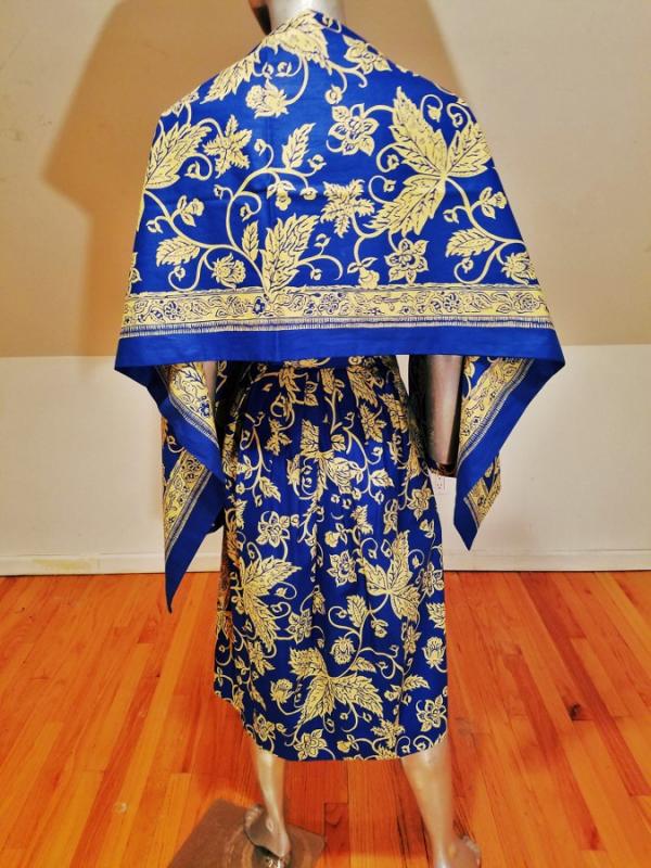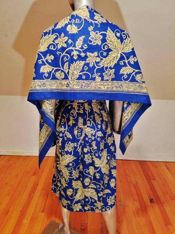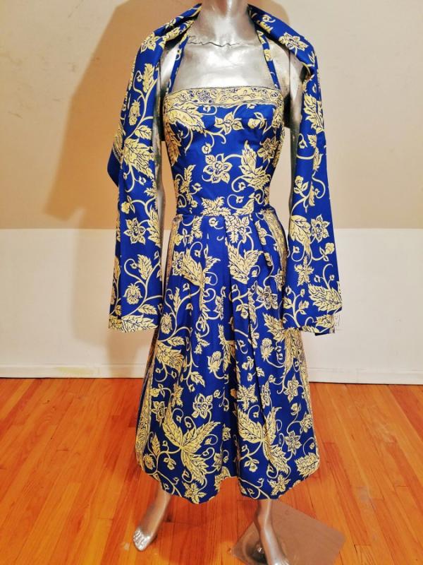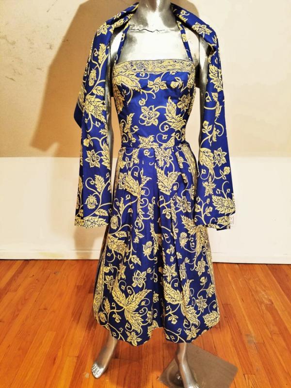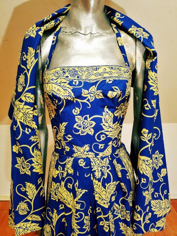 A rare and stunning Polynesian ensemble of dress and long shawl hand painted print in a Batik style Circa 1940's . The details and look are amazing. Truly a work of Wearable Art . Belonged to