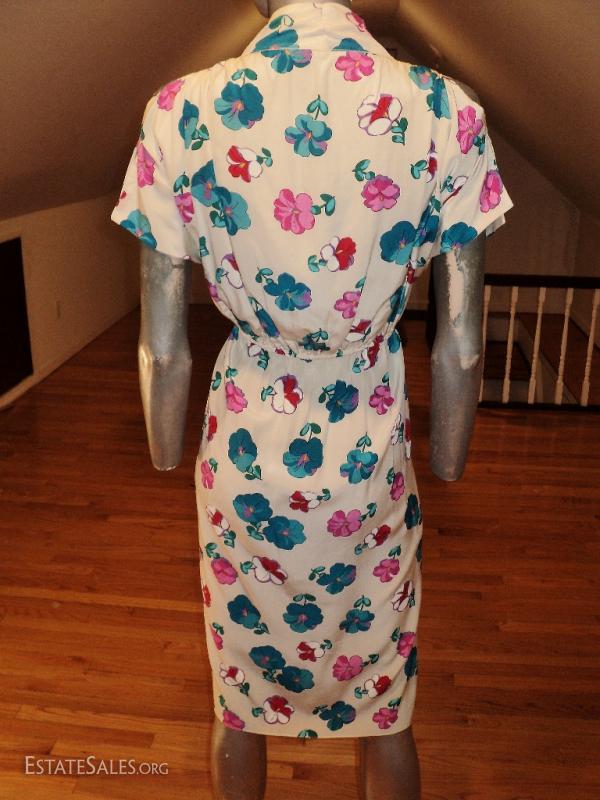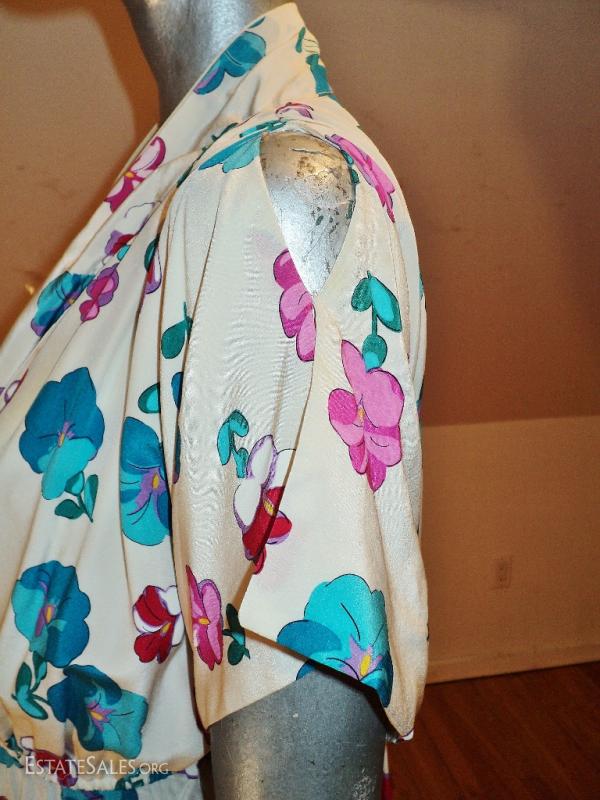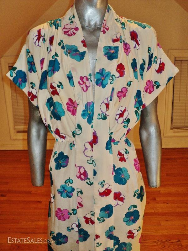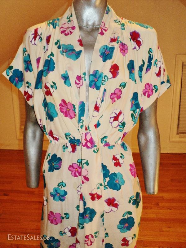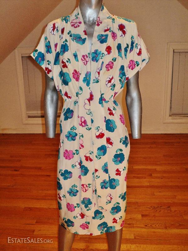 This one is a beauty from the late 1940's fluid silk lined and hand finished bodice and front tie , side slits with hidden pockets. dolman kind of sleeve. In very good vintage condition and a beauty