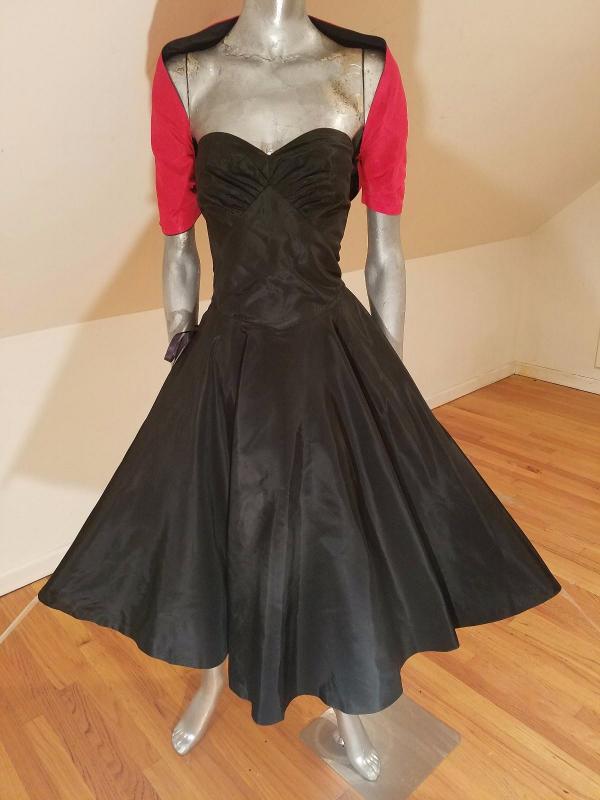 An amazing beauty of a dress and shrug in taffeta with a red shrug and a side kitten bow,this one is timeless a Collectors dream