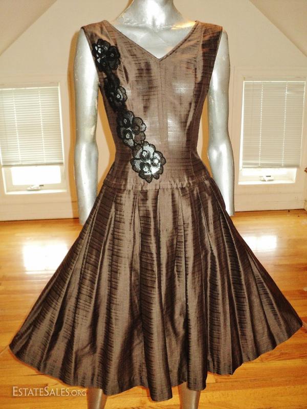 A 1950 full sweep dress with French guipure inserts.