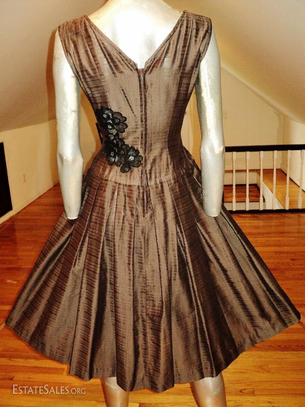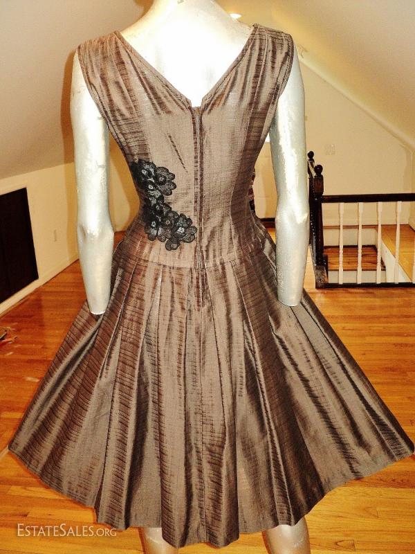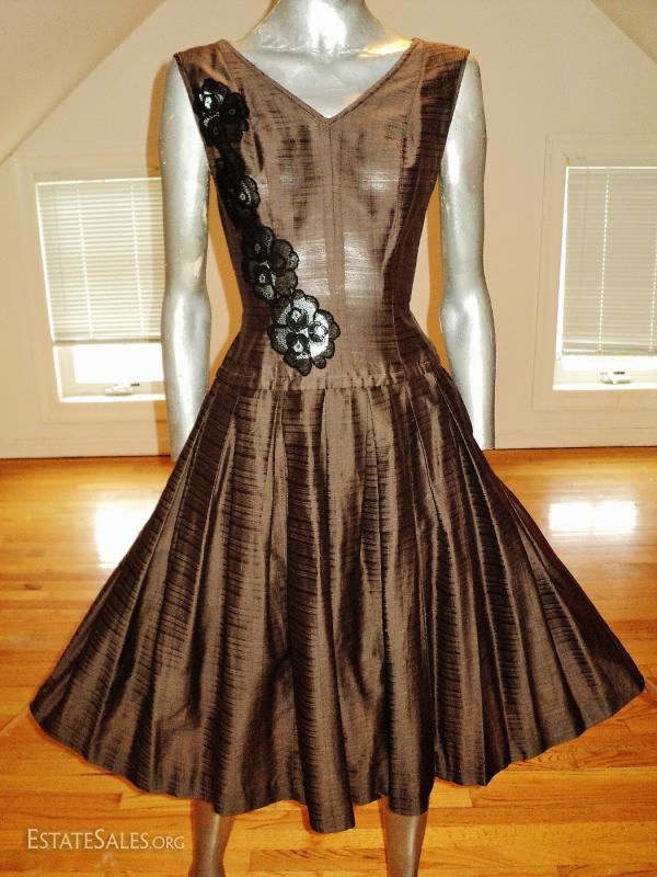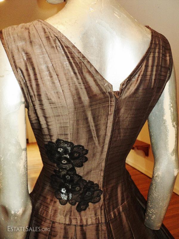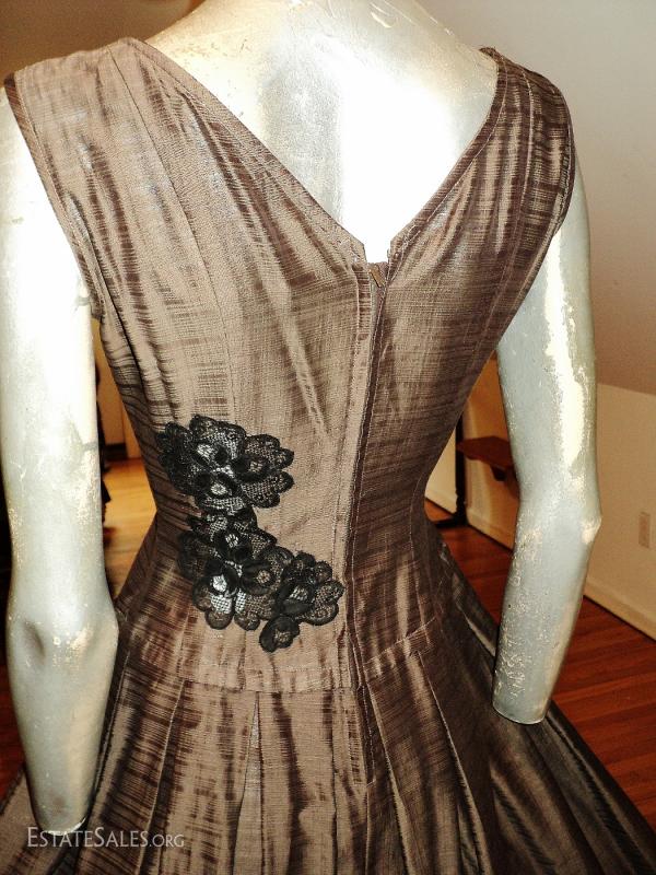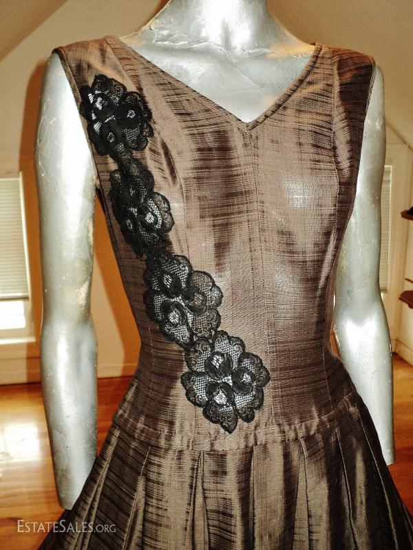 A 1950 full sweep dress with French guipure inserts.