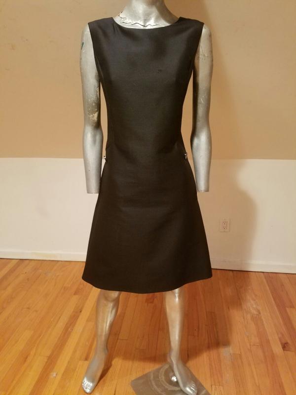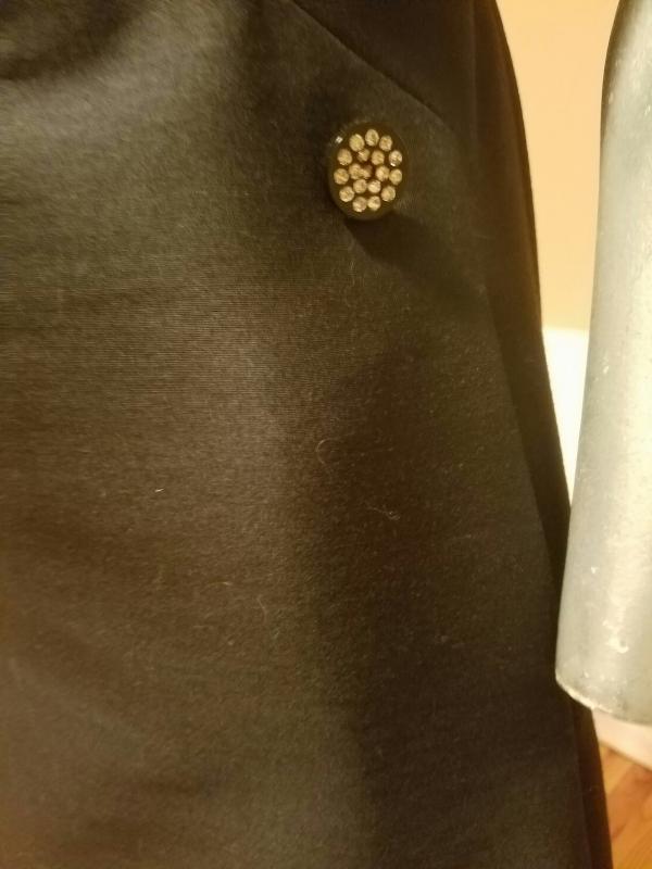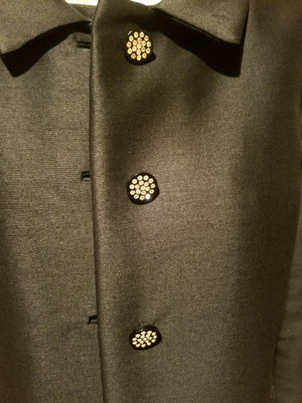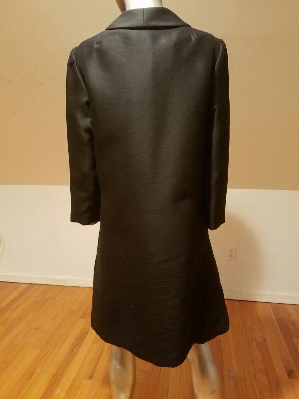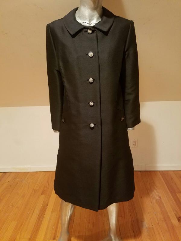 A beautiful silk shantung Opera Coat and dress ensemble. Bakelite Rhinestone buttons and white raised floral brocade coat line.Fully lined and stunning.