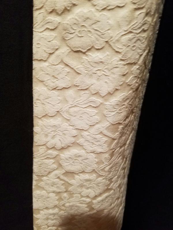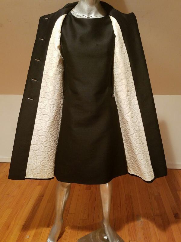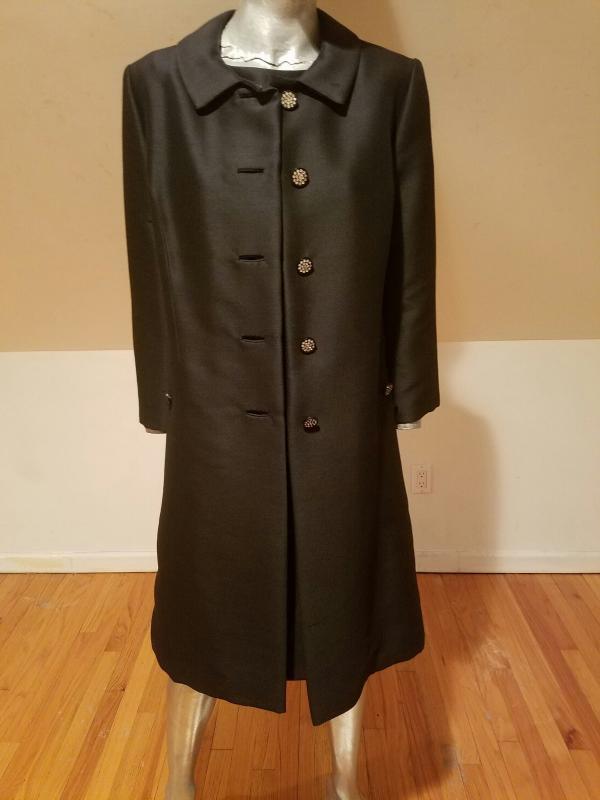 A beautiful silk shantung Opera Coat and dress ensemble. Bakelite Rhinestone buttons and white raised floral brocade coat line.Fully lined and stunning.