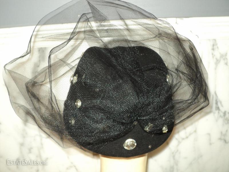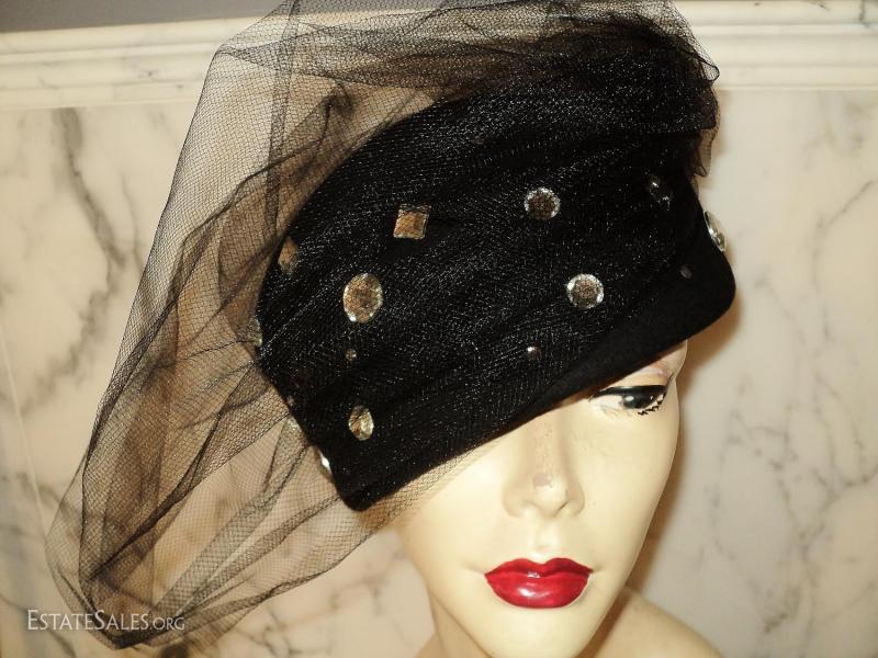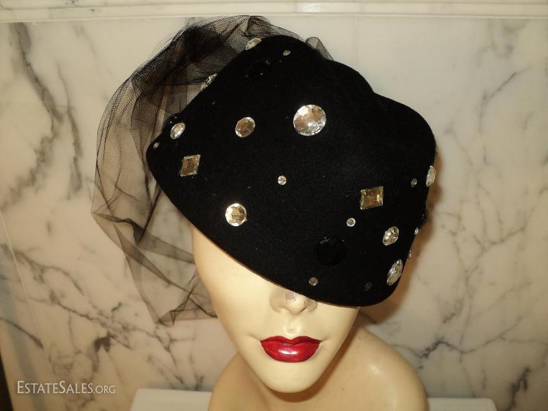 Amazing French Breton Style hat fascinator. from the late 1950's by then famous Geo.W.Bollman & Co, Inc. 100% wool felt tulle covering with different shape & size rhinestones.