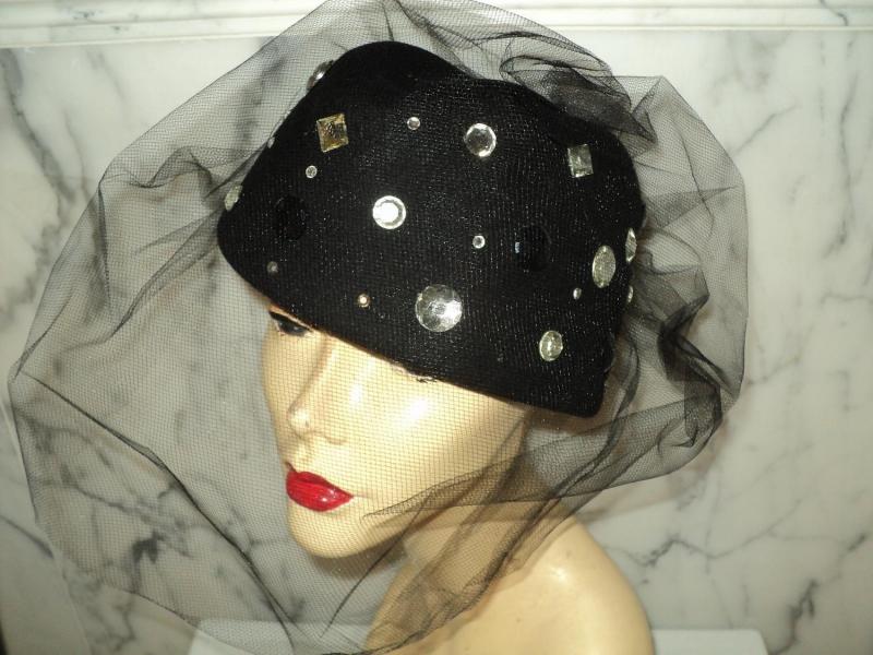 Amazing French Breton Style hat fascinator. from the late 1950's by then famous Geo.W.Bollman & Co, Inc. 100% wool felt tulle covering with different shape & size rhinestones.