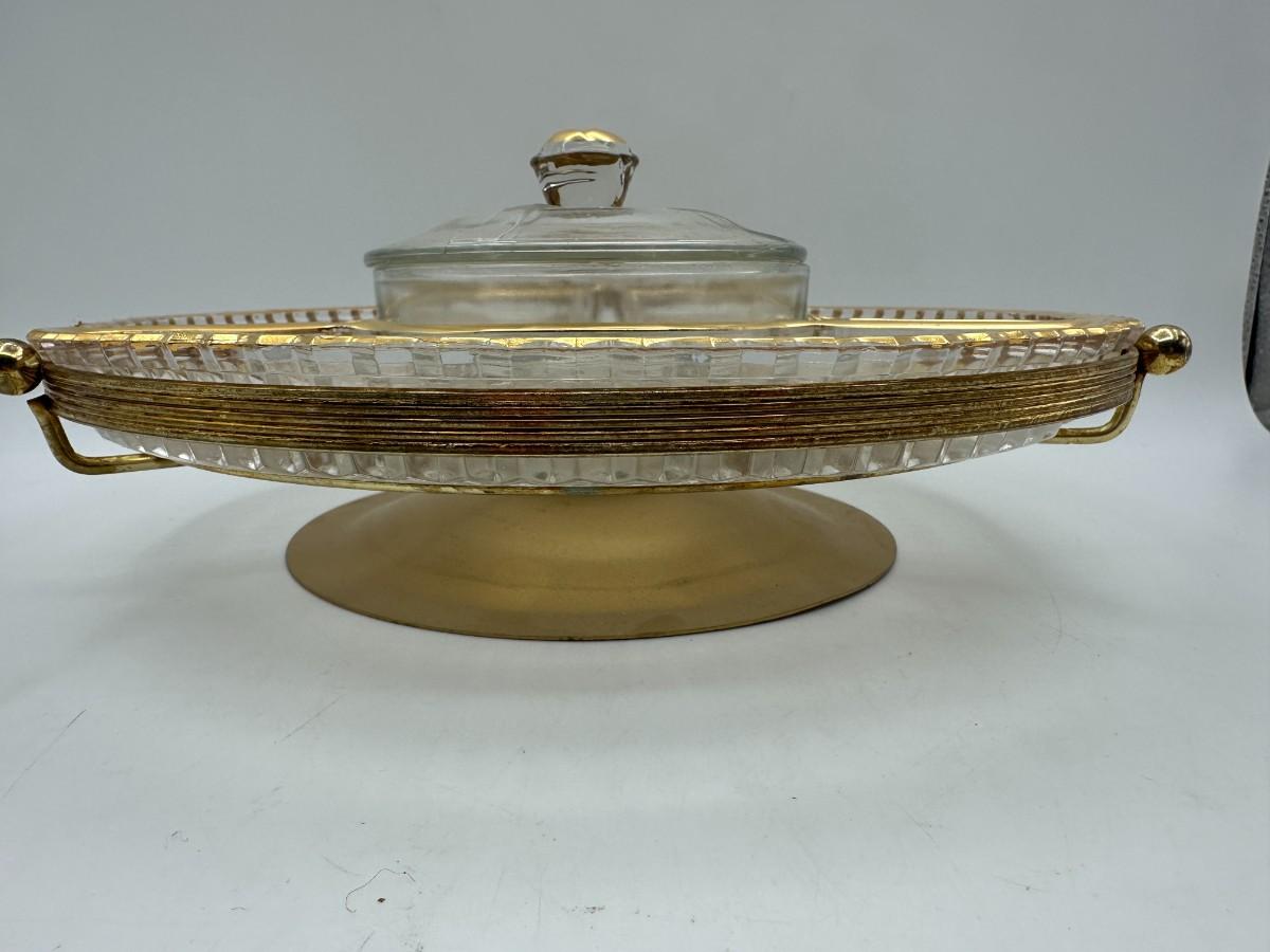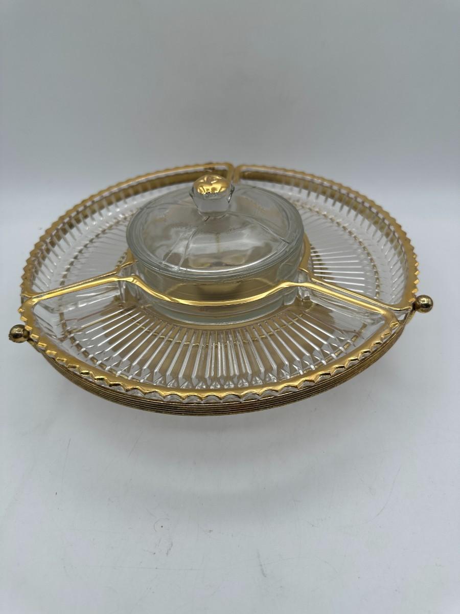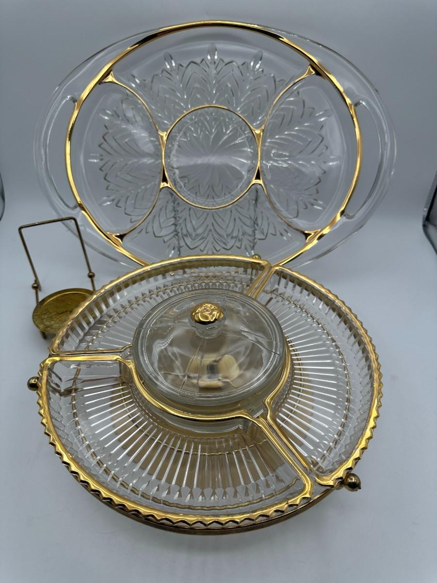 Vtg. 1950's Glass & Gold Lazy Susan & Relish Dish