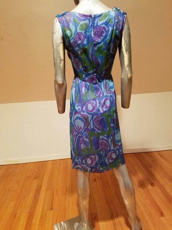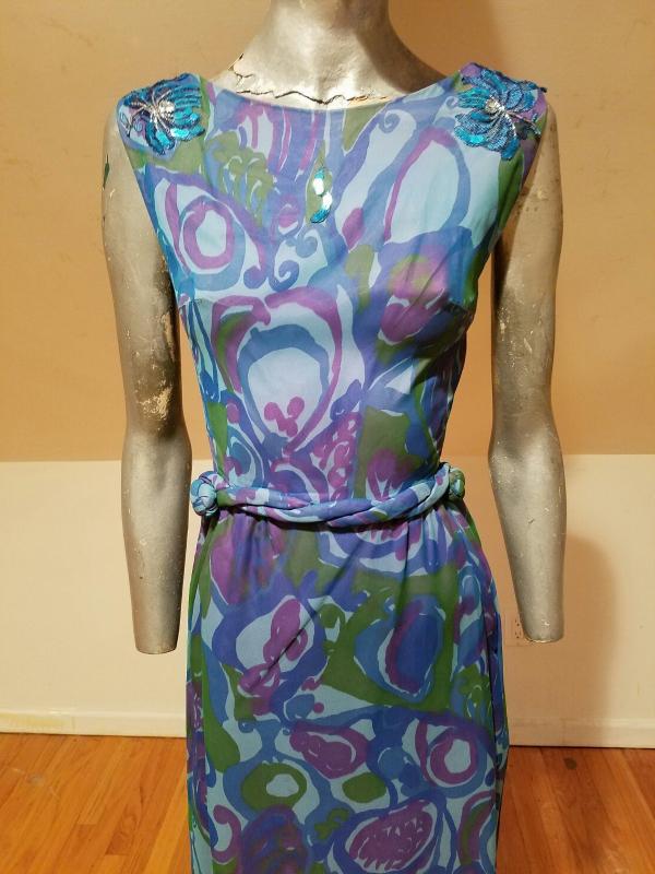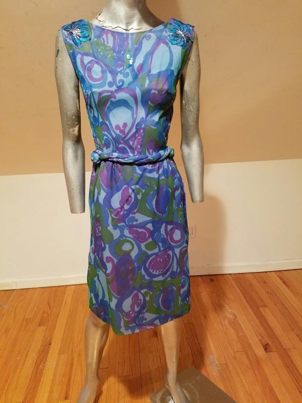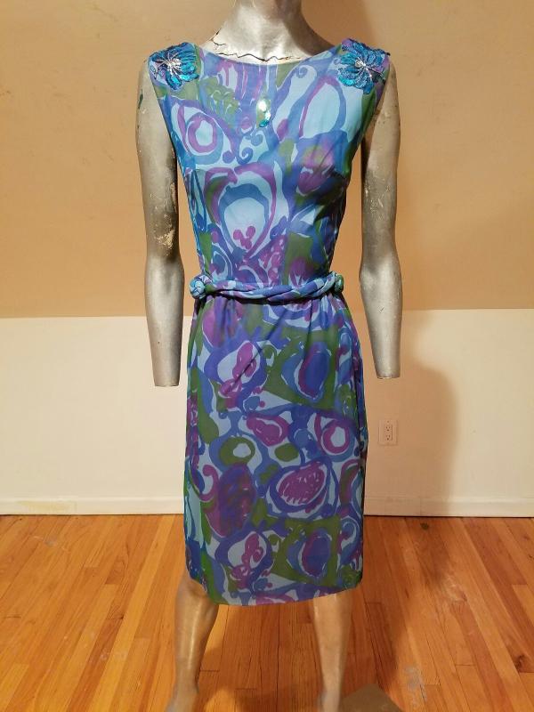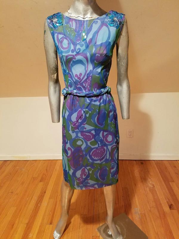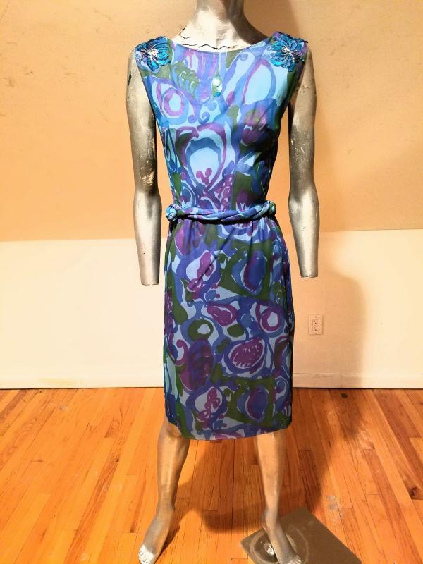 A beautiful silk screened swirl design wiggle dress with a braided front belt and beaded embellishments at top of shoulders. The back has a metal zipper