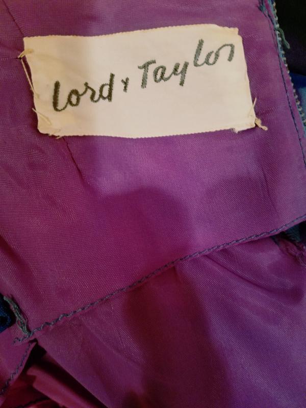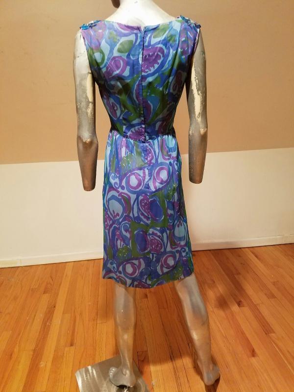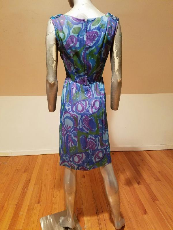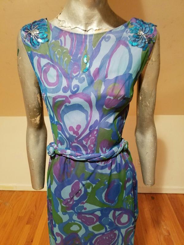 A beautiful silk screened swirl design wiggle dress with a braided front belt and beaded embellishments at top of shoulders. The back has a metal zipper