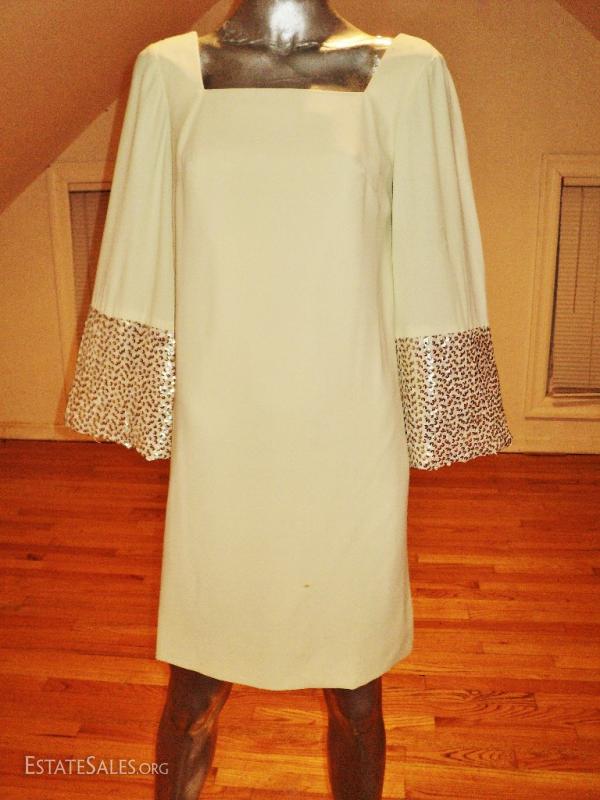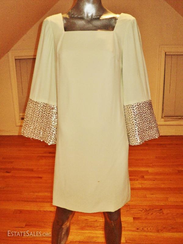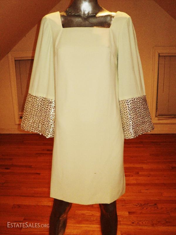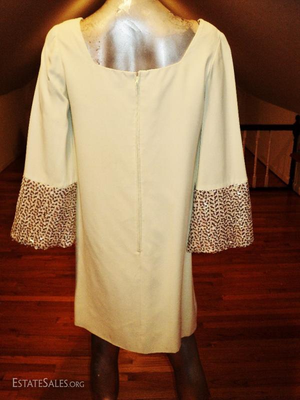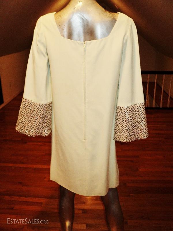 True to the era A beautiful heavily sequin/pearl embellished A line trapeze . Bell sleeves back metal zipper. Great vintage condition will need refresh spot clean