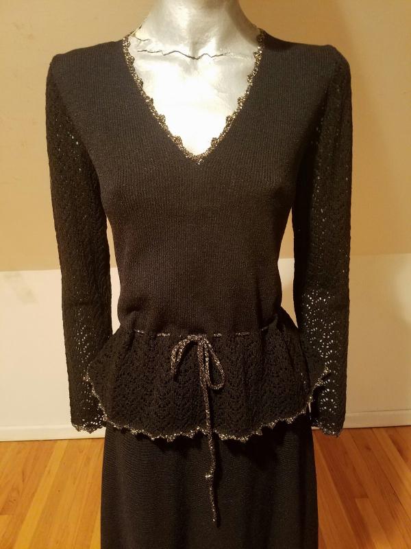 Stunning black Santana Knit with gold lame' trim skirt ensemble. By Agatha for Jack Donsky. Open trim work at sleeves and bodice hem