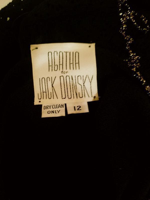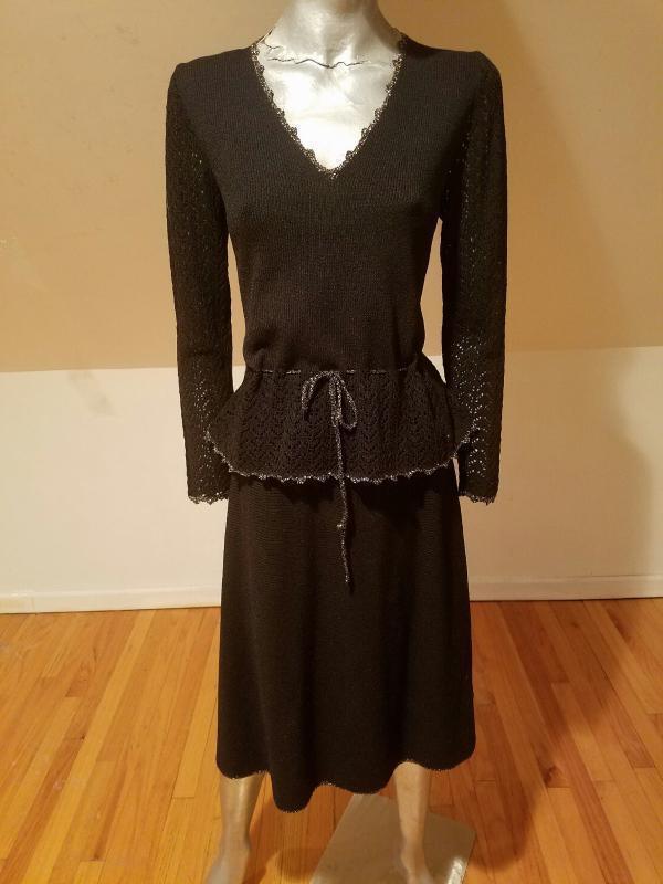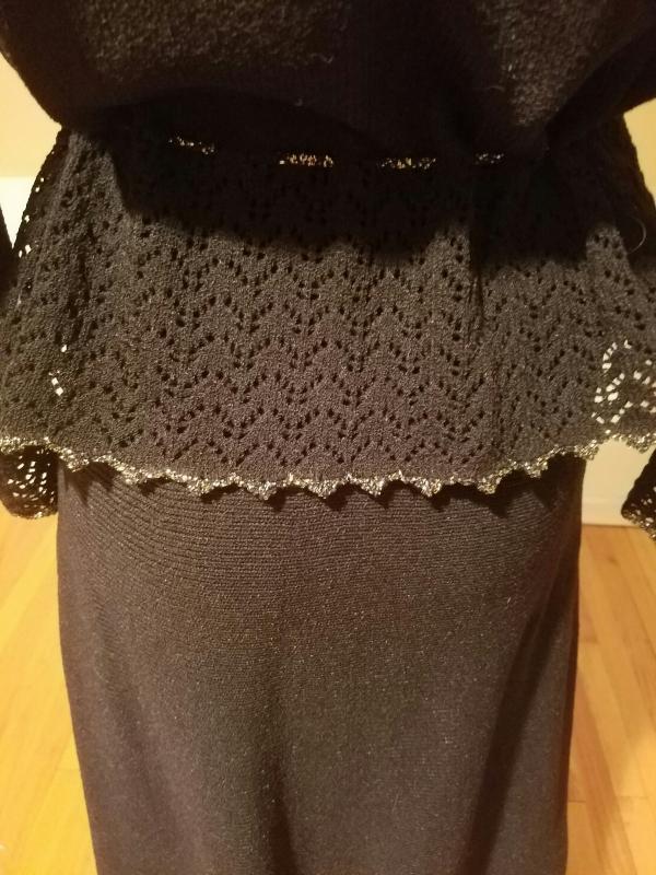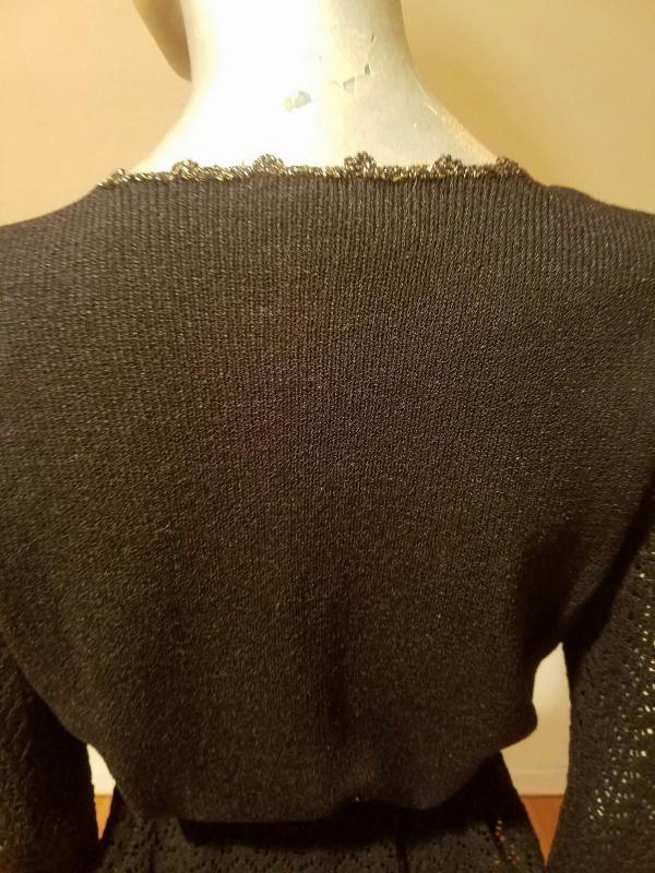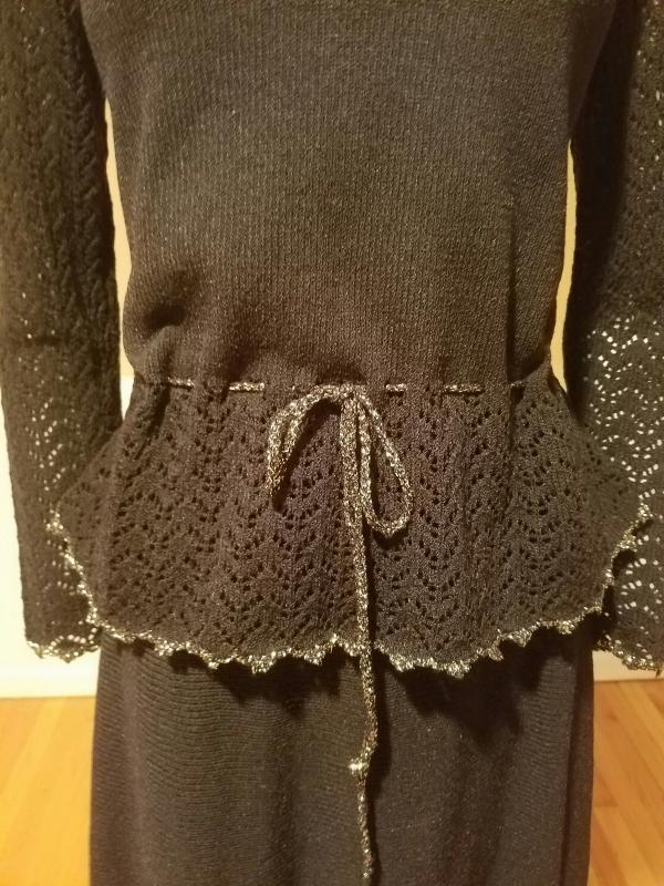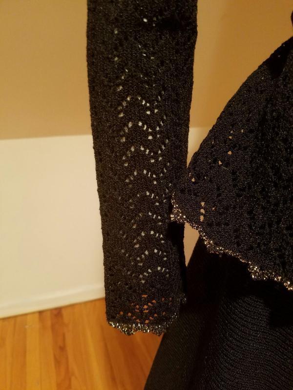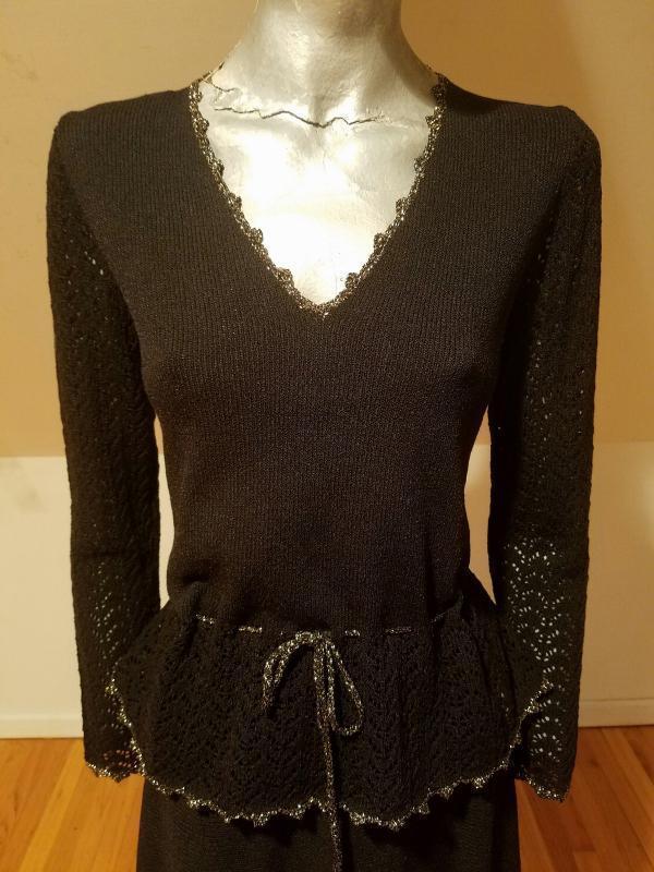 Stunning black Santana Knit with gold lame' trim skirt ensemble. By Agatha for Jack Donsky. Open trim work at sleeves and bodice hem