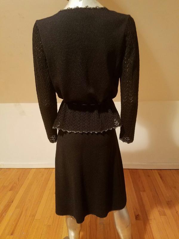 Stunning black Santana Knit with gold lame' trim skirt ensemble. By Agatha for Jack Donsky. Open trim work at sleeves and bodice hem