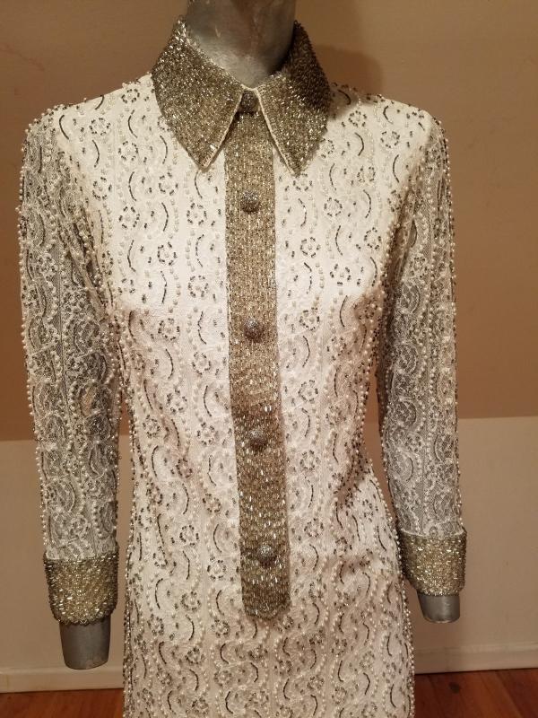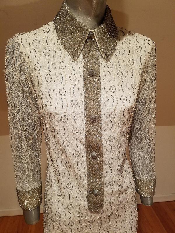 Silver bugle beads on a button shirt front The buttons are all hand beaded as is the dress