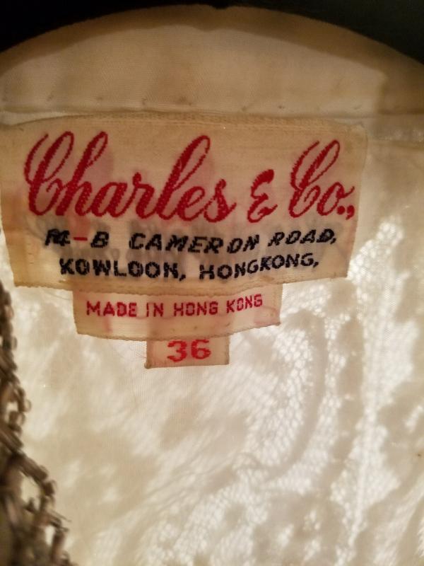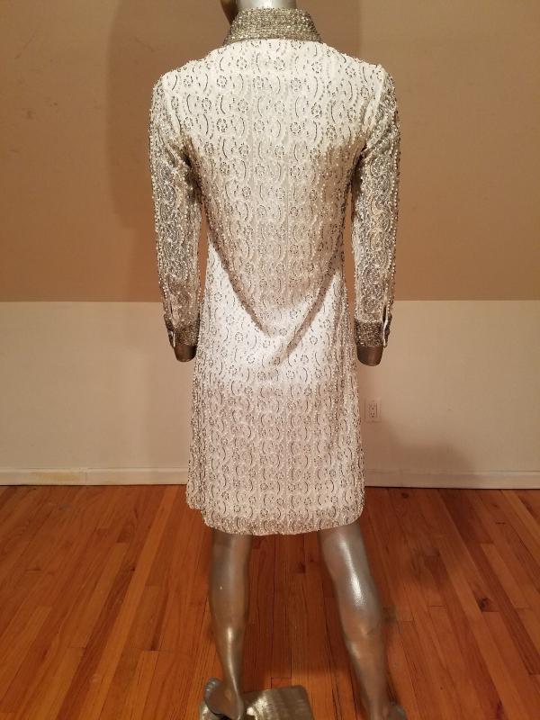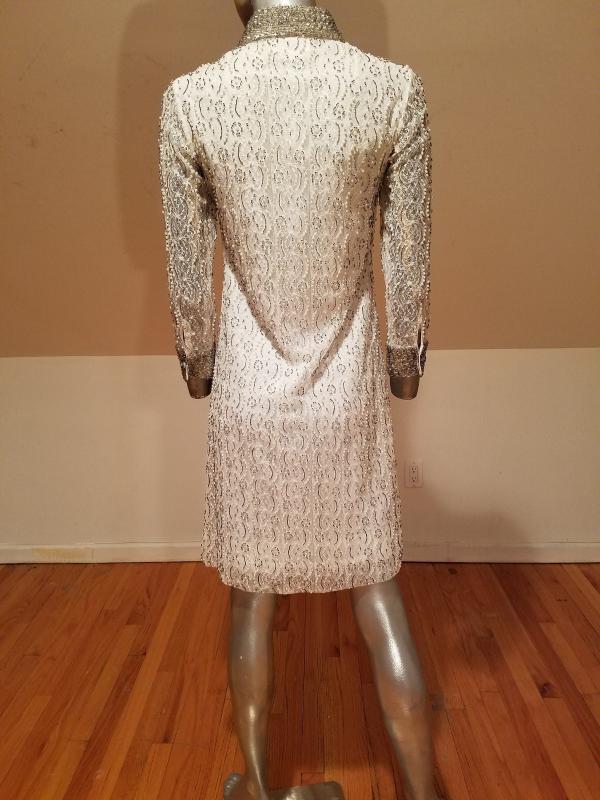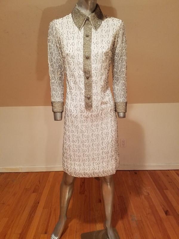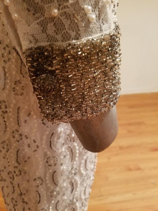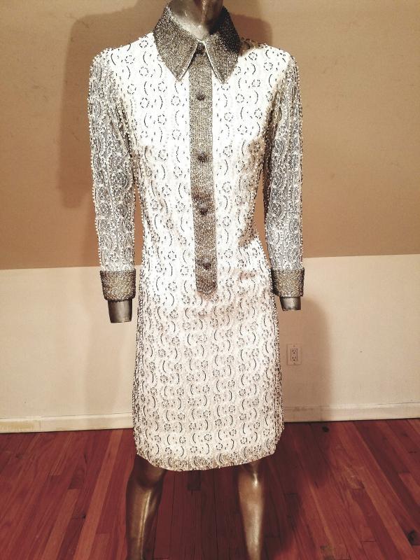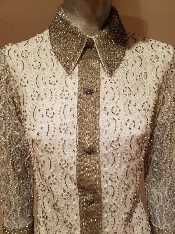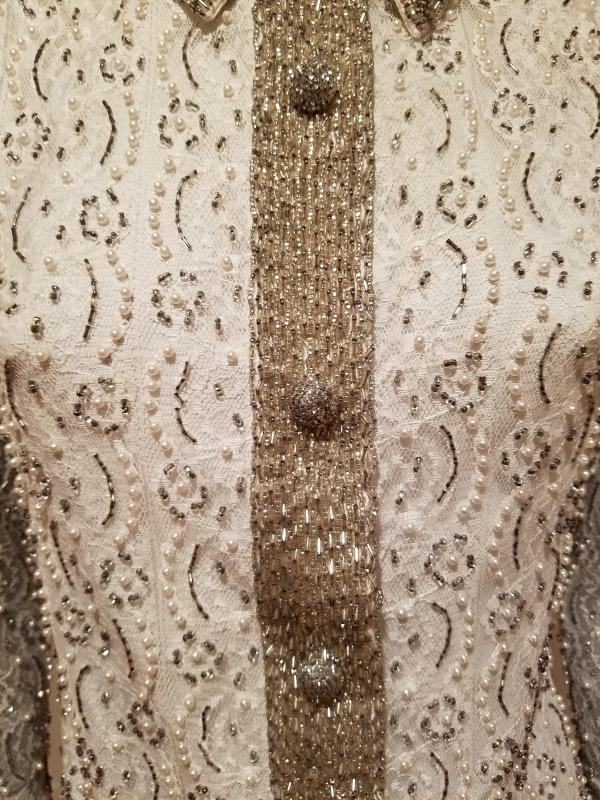 Silver bugle beads on a button shirt front The buttons are all hand beaded as is the dress