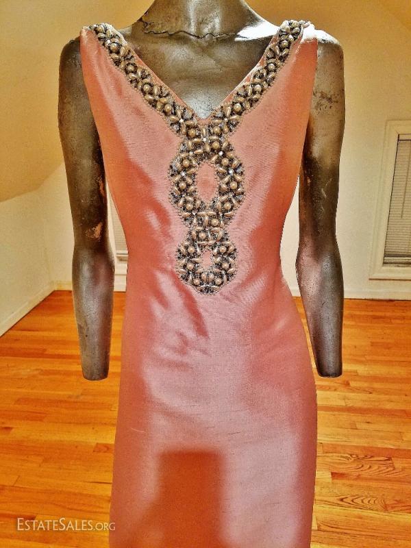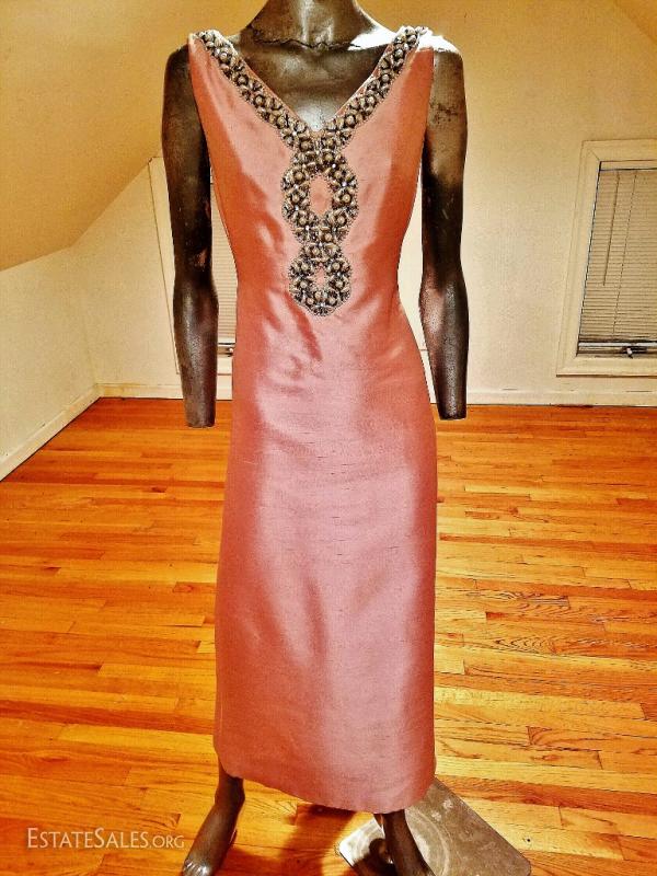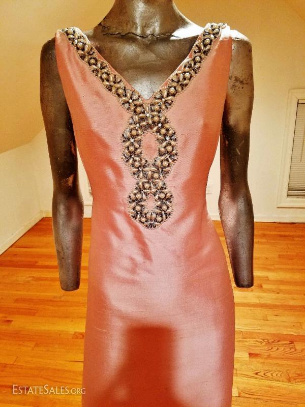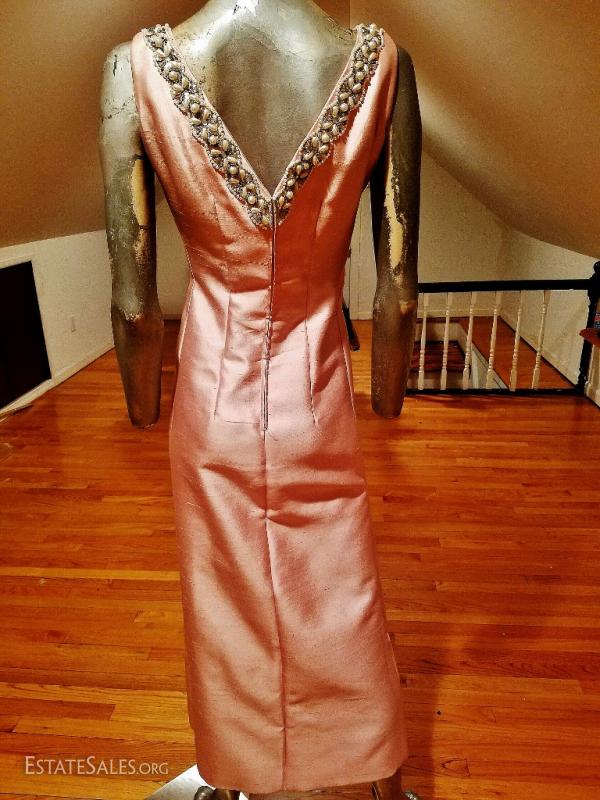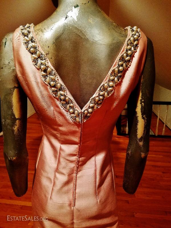 A stunner from the 1960's silk shantung heavenly ballet pink coloration heavily embellished . V front & back. Lined with raw silk. Pictures cannot do this one justice