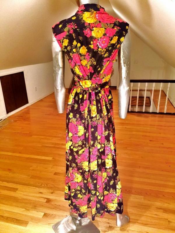 Vtg 1960's brushed jersey maxi floral gown Austrian crystal buttons tie back