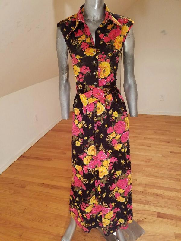 Vtg 1960's brushed jersey maxi floral gown Austrian crystal buttons tie back