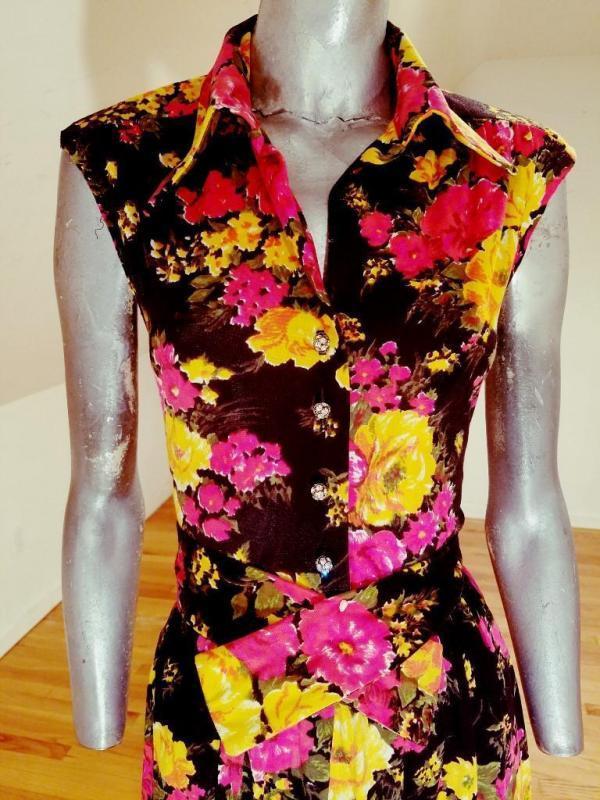 Vtg 1960's brushed jersey maxi floral gown Austrian crystal  buttons tie back