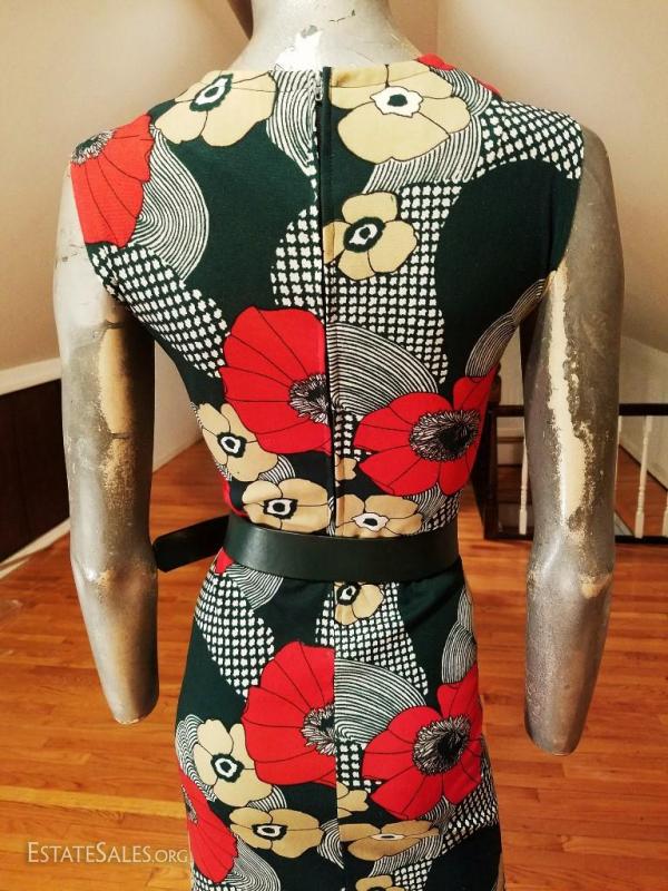 Forever Young by Puritan stunning wiggle dress.Floral painted print adorned by a leather belt with tortoise buckle. Amazing vintage condition. And very Collectible
