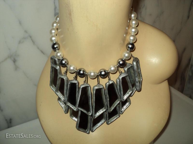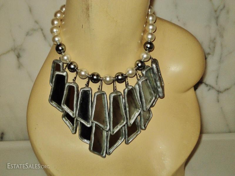 Vtg 1960's Gun Metal Necklace hanging mirrors on resin choker style with pearls