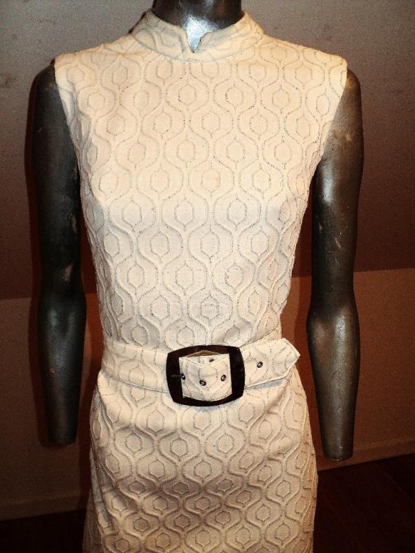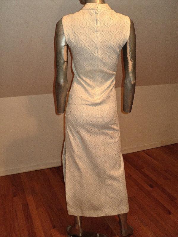 This one is rare and very collectible.It is a Cheongsam Chipao style maxi dress with silver lame' 3D embroidered brocade fabric and metal silver buckled belt. high open side slits. In very good vintage condition and a stunner.