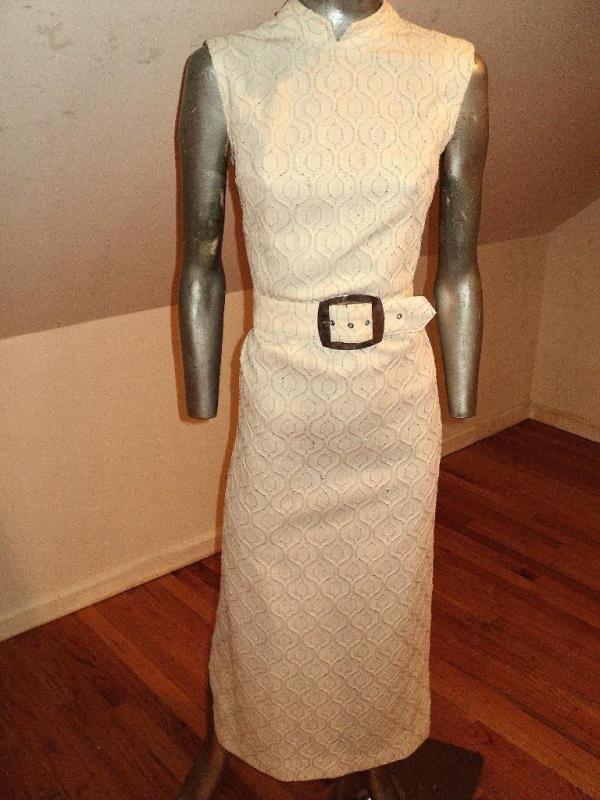 This one is rare and very collectible.It is a Cheongsam Chipao style maxi dress with silver lame' 3D embroidered brocade fabric and metal silver buckled belt. high open side slits. In very good vintage condition and a stunner.