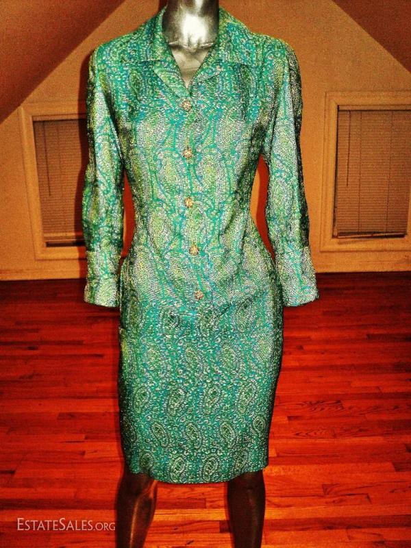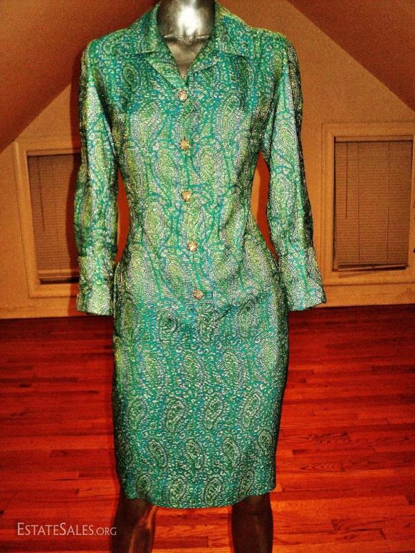 Aqua metallic Gold brocade coat dress with amazing gold and rhinestone buttons.