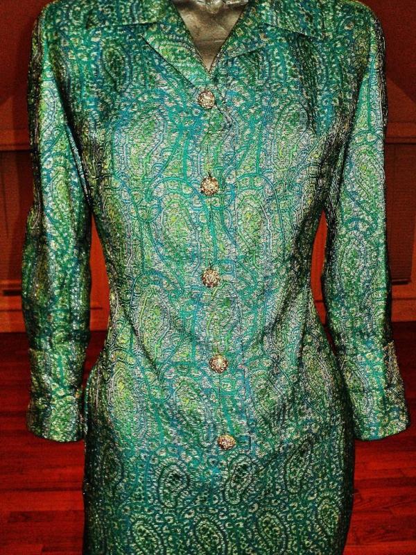 Aqua metallic Gold brocade coat dress with amazing gold and rhinestone buttons.