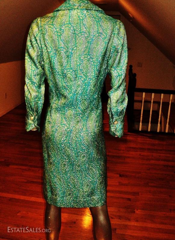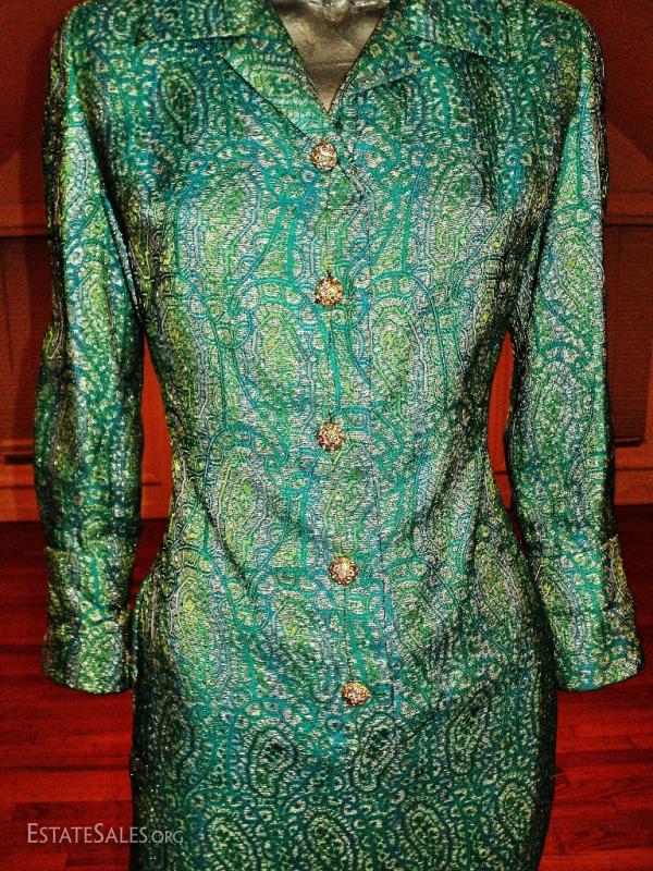 Aqua metallic Gold brocade coat dress with amazing gold and rhinestone buttons.